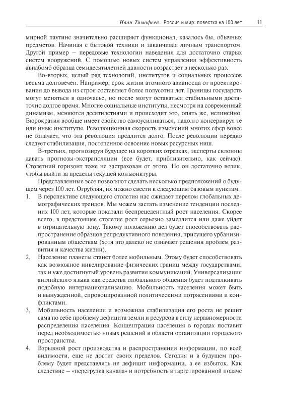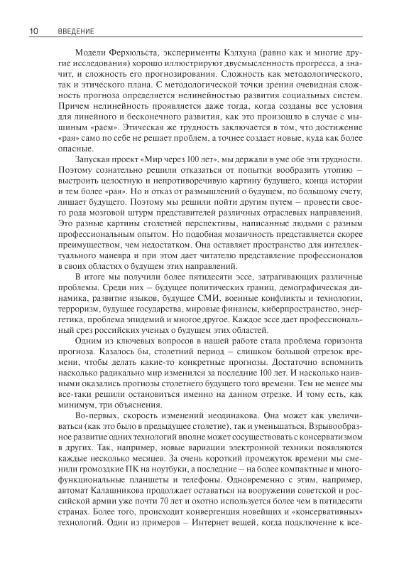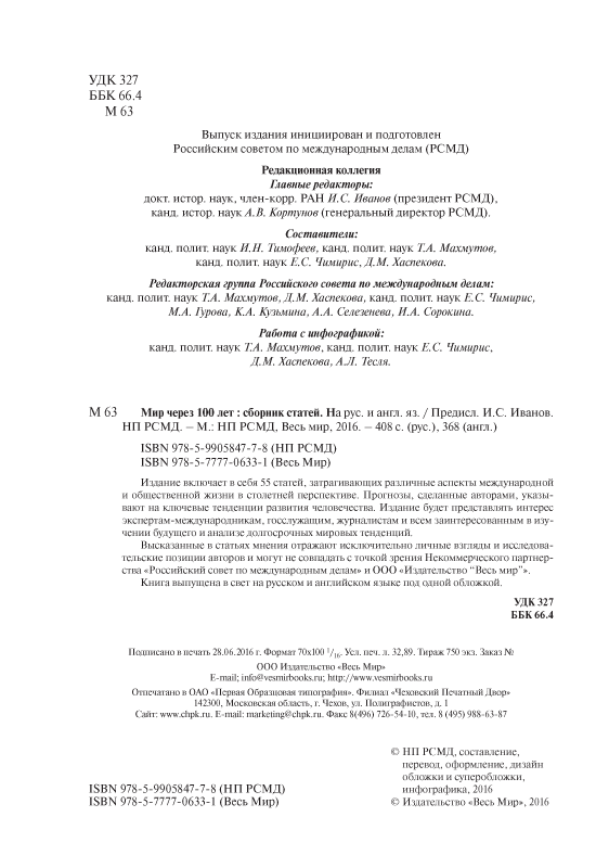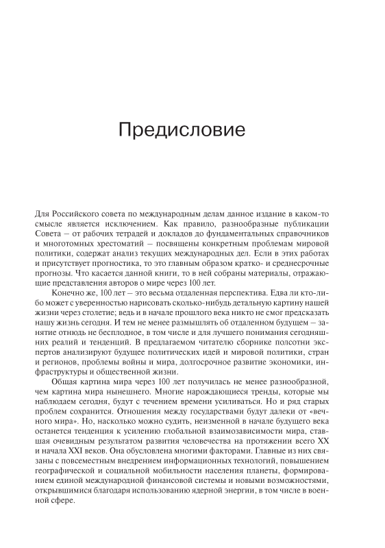 - Авторы 55-ти статей взялись, по инициативе Российского совета по международным делам, представить то, каким будет Мир через век. Книга «Мир через 100 лет» издана на русском и английском языках. Обе части книги собраны под одной обложкой.