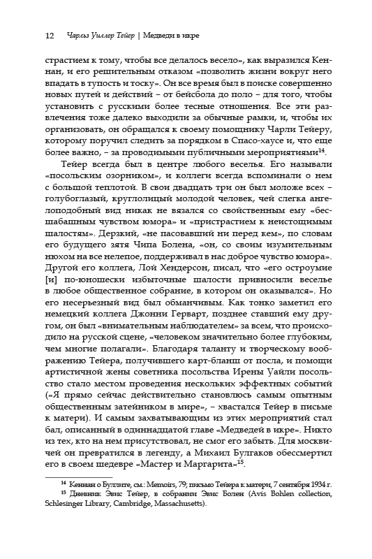 Воспоминания американского дипломата Чарльза Тейера (1910–1969), работавшего в составе первого посольства США в Москве в 30-е годы прошлого века, публикуются на русском языке впервые. Однако отдельные сюжеты книги Тейера давно получили широкую известность. Они связаны с проведением в посольстве США в Москве в 1934–1935 гг. роскошных приемов и феерического «Весеннего фестиваля», послужившего для одного из гостей посольства – Михаила Булгакова – прообразом бала у сатаны в романе «Мастер и Маргарита». Организатором этого фестиваля был Тейер.