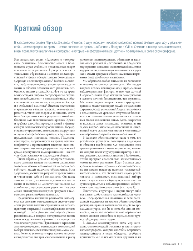 - В Докладе о человеческом развитии за 2014 г., озаглавленном «Обеспечение устойчивого прогресса человечества: уменьшение уязвимости и формирование жизнестойкости», рассмотрены две концепции, которые тесно связаны между собой и чрезвычайно важны для обеспечения...