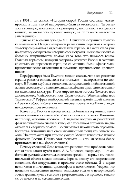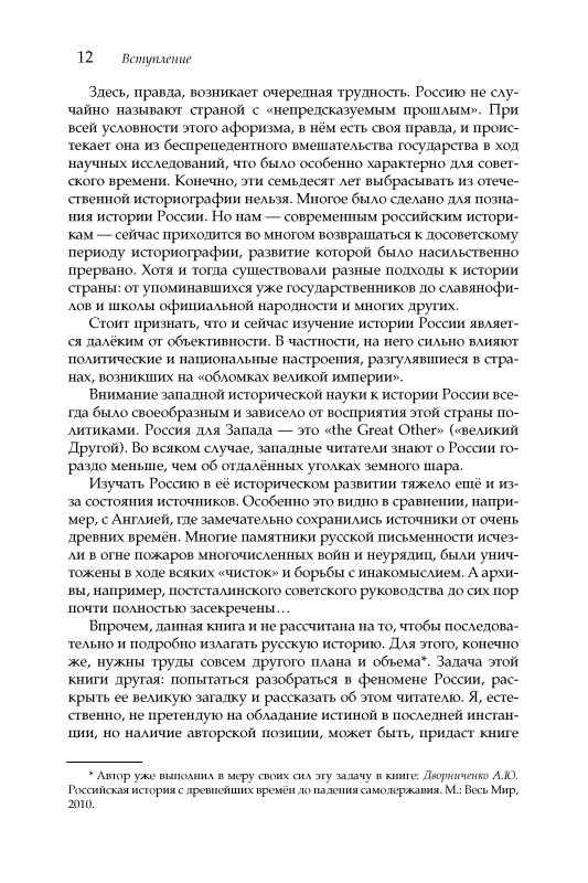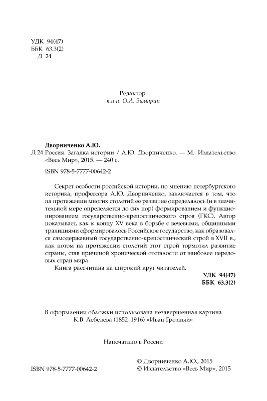 Секрет особости российской истории, по мнению петербургского историка, профессора А.Ю. Дворниченко, заключается в том, что на протяжении многих столетий ее развитие определялось (и в значительной мере определяется до сих пор) формированием и функционированием государственнокрепостнического строя (ГКС). Автор показывает, как к концу XV века в борьбе с вечевыми, общинными традициями сформировалось Российское государство, как образовался самодержавный государственнокрепостнический строй в XVII в., как потом на протяжении столетий этот строй тормозил развитие страны, став причиной хронической отсталости от наиболее передовых стран мира.