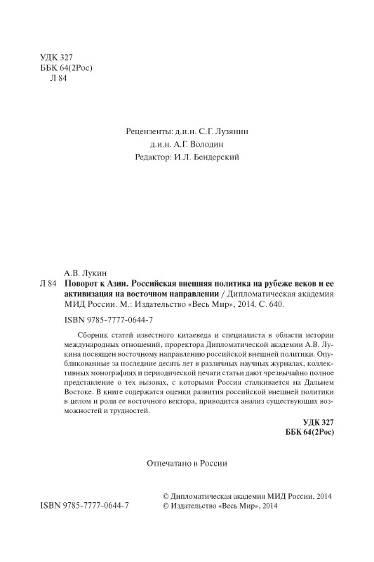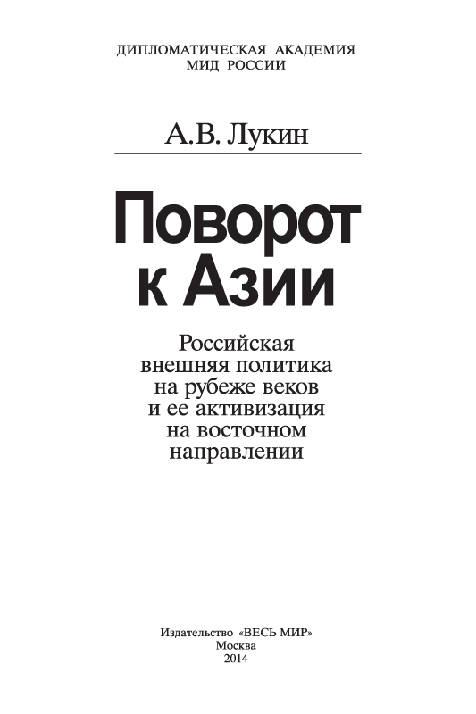 - К выходу в свет книги Александра Лукина: «Поворот к Азии. Российская внешняя политика на рубеже веков и ее активизация на восточном направлении».