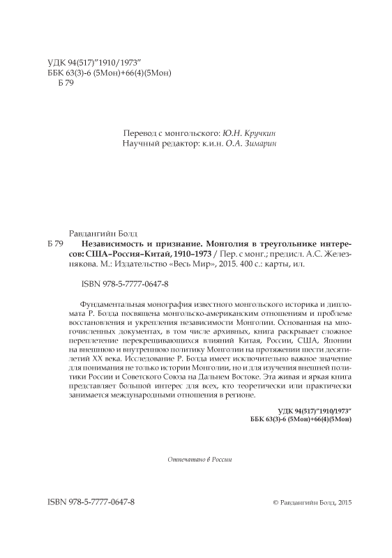 Фундаментальная монография известного монгольского историка и дипломата Р. Болда посвящена монгольско-американским отношениям и проблеме восстановления и укрепления независимости Монголии. Основанная на многочисленных документах, в том числе архивных, книга раскрывает сложное переплетение перекрещивающихся влияний Китая, России, США, Японии на внешнюю и внутреннюю политику Монголии на протяжении шести десятилетий XX века. Исследование Р. Болда имеет исключительно важное значение для понимания не только истории Монголии, но и для изучения внешней политики России и Советского Союза на Дальнем Востоке. Эта живая и яркая книга представляет большой интерес для всех, кто теоретически или практически занимается международными отношения в регионе.