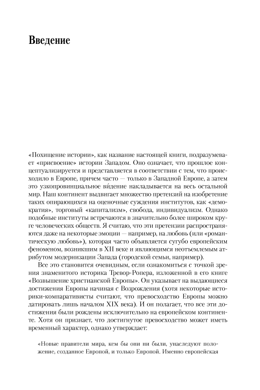 Один из известнейших современных специалистов в области культурной антропологии, кембриджский профессор Джек Гуди (р. 1919) широко известен своим критическим отношением к узкому европоцентристскому подходу к изучению человеческой цивилизации. Системная и цельная критика такого подхода и составляет основное содержание его книги. По мнению Гуди, честь изобретения демократии, капитализма, индивидуализма и романтической любви не принадлежит Западу, равно как и многих конкретных открытий, совершенных человечеством. Он детально рассматривает взгляды и теоретические построения многих замечательных ученых и мыслителей — Маркса, Вебера, Элиаса, а также почитаемых им историков Броделя, Финли, Андерсона и др. Гуди предлагает использовать компаративную методологию кросс-культурного анализа, которая создает намного более полную основу для оценки разнообразных исторических процессов и должна заменить устаревшие представления о различиях между Западом и Востоком.