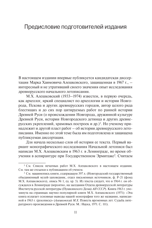 Летопись «Повесть временных лет» (ПВЛ) – ценнейший памятник культуры всех восточнославянских народов, лежащий в основе русской письменности и истории. Непреходящее значение ПВЛ, необходимость ее углубленного изучения подчеркивали такие крупнейшие авторитеты отечественной науки и культуры, как академики А.А. Шахматов и Д.С. Лихачёв. Изучению ПВЛ посвящено немало работ. Но в ряду приобретений отечественной культуры и науки, которыми являются ценные исследования этого уникального памятника культуры, есть и непростительные потери. Такой бесспорной потерей до недавнего времени было отсутствие доступной публикации труда одного из самых замечательных исследователей ПВЛ – историка, филолога и археолога М.Х. Алешковского (1933–1974).