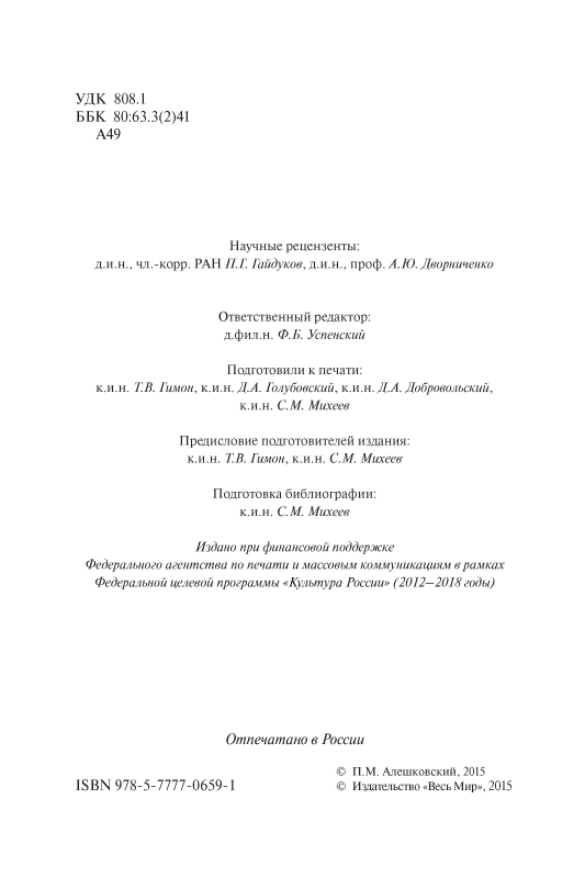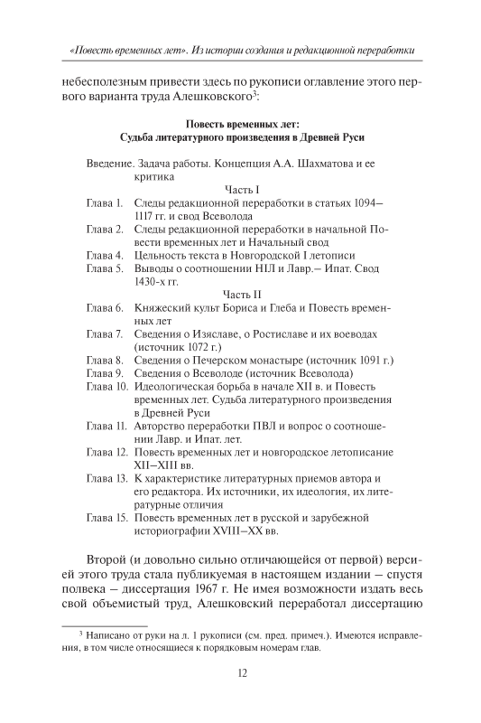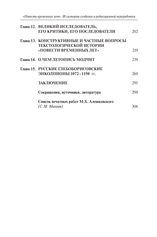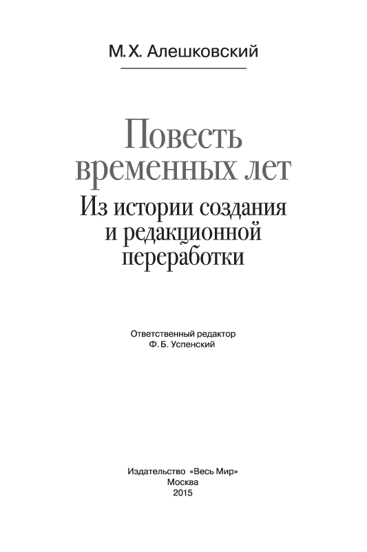Тщательно подготовленная публикация труда М.Х. Алешковского, выполненная коллективом историков и филологов (д.и.н. Т.В. Гимон, к.и.н. Д.А. Голубовский, к.и.н. Д.А. Добро вольский, к.и.н. С.М. Михеев, д.фил.н. Ф.Б. Успенский), призвана внести вклад в развитие наших знаний о «Повести временных лет».