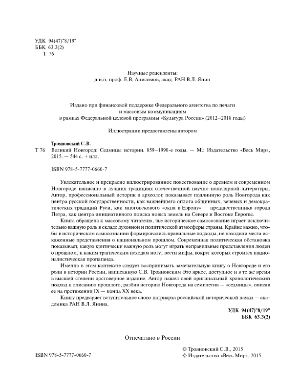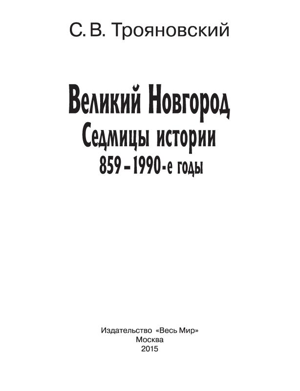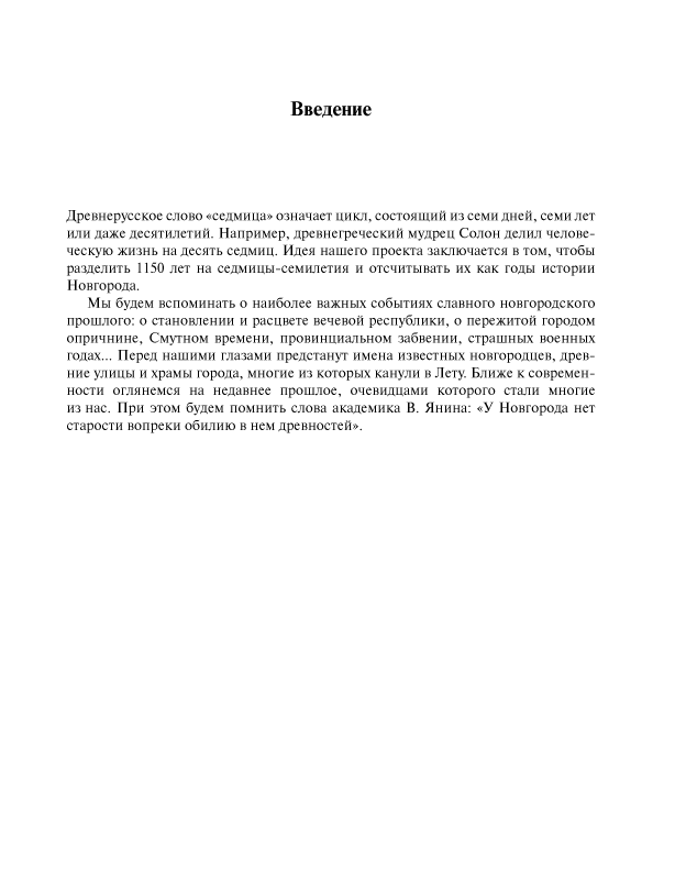 Именно в этом контексте следует воспринимать замечательную книгу о Новгороде и его роли в истории России, написанную С.В. Трояновским Это яркое, доступное и в то же время в высшей степени достоверное издание. Автор нашел свой оригинальный хронологический подход к описанию прошлого, разбив историю Новгорода на семилетия — «седмицы», описав ее на протяжении IX — конца XX века.