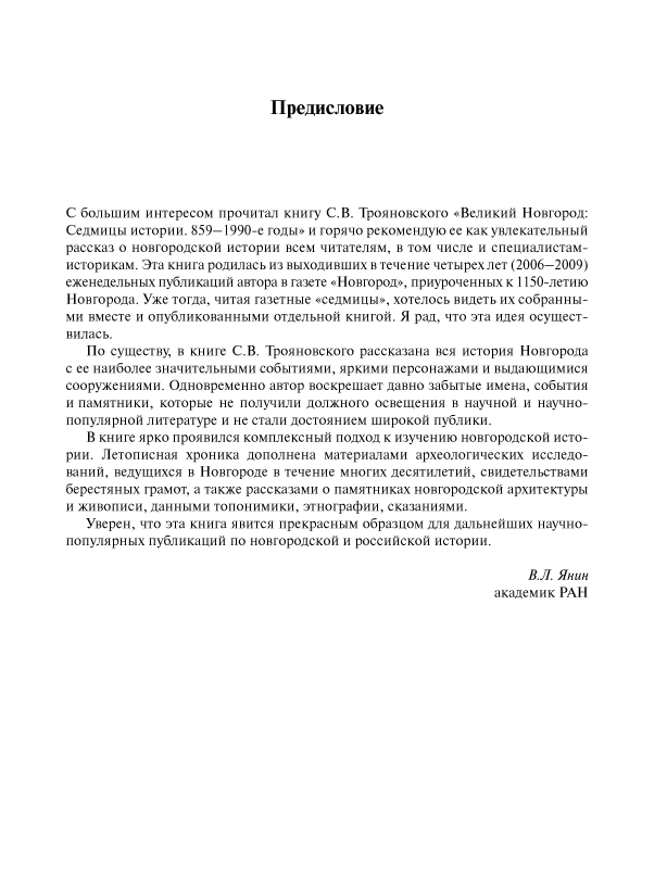 - С большим интересом прочитал книгу С. В. Трояновского «Великий Новгород: Седмицы истории. 859-1990-е годы» и горячо рекомендую ее как увлекательный рассказ о новгородской истории всем читателям, в том числе и специалистам-историкам. Эта книга родилась из выходивших...