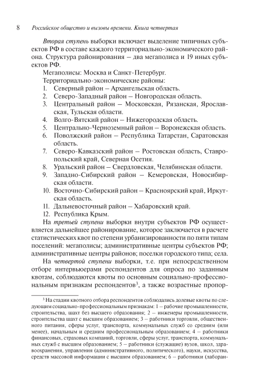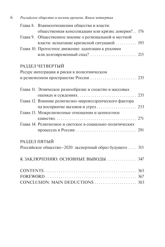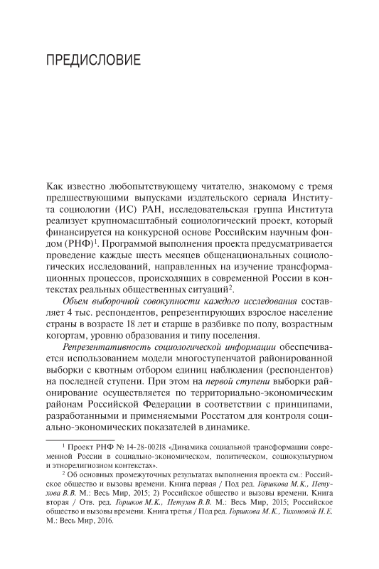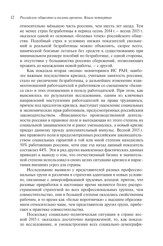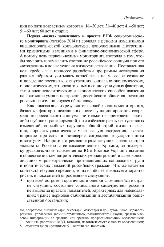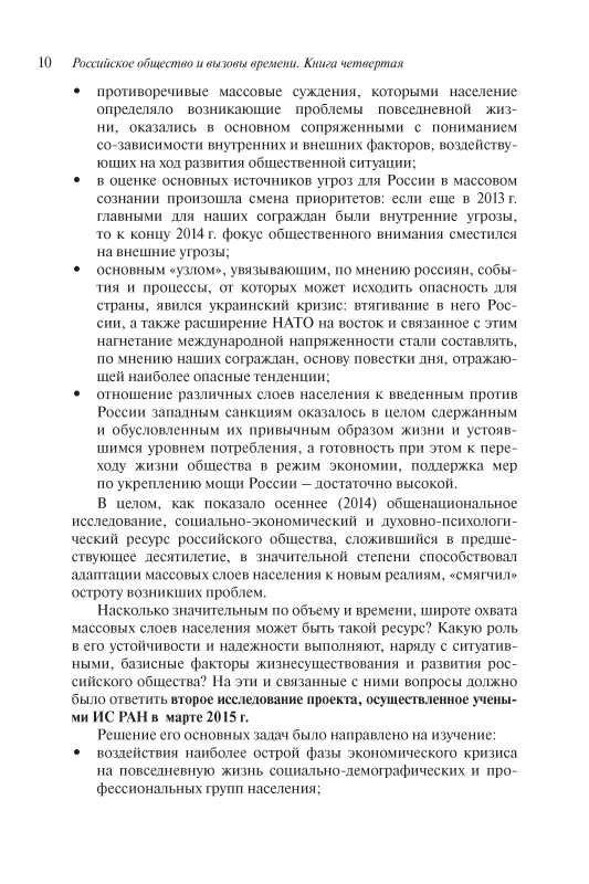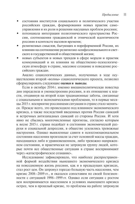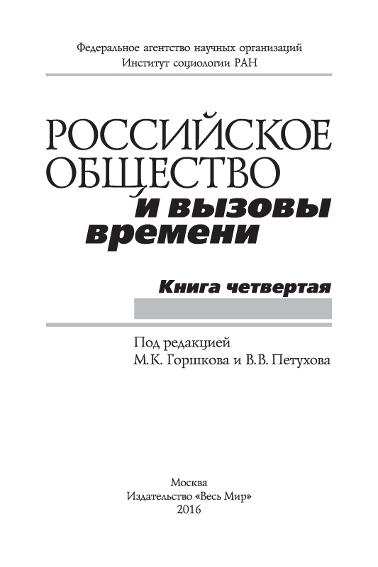 В книге дается многоаспектный анализ результатов четвертой «волны» общенационального социологического исследования состояния и динамики российского общества в контексте новой реальности, обусловленной внешними и внутренними угрозами и рисками. Особое внимание уделяется экономическому и политическому поведению населения в кризисных условиях, устойчивости и изменчивости мировоззренческих ориентаций и жизненных приоритетов россиян, анализу ресурсов социальной интеграции в полиэтническом и религиозном пространстве России. При этом представления о массовом восприятии новой действительности дополняются экспертным анализом перспектив развития российского общества.