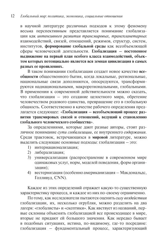 За последнюю четверть века о глобализации написаны тысячи работ, о глобальном мире – единицы. Между тем давно пора исследовать именно продукт многочисленных глобализационных процессов – человечество, трудно и мучительно обретающее родовое единство. В книге, написанной профессором МШЭ МГУ В.Б. Кувалдиным, испробована комбинация подходов, сочетая общий портрет глобального мира с его более детальной проработкой по макрорегиональным составляющим. Получилась своеобразная система зеркал, в которой все познается и оценивается в сравнении. В ней одинаково значимы и общие элементы, задаваемые каркасом транспланетарных связей, и историко-социальные макрообщности, все более тесно взаимодействующие между собой. Мир, превращающийся в огромную коммунальную квартиру, ревниво хранит национально-государственную идентичность и одновременно создаёт различные наднациональные общности. Его рискованный прорыв в новое состояние открывает невиданные возможности и порождает смертельные опасности и угрозы. Он уподобился канатоходцу, работающему на большой высоте без страховки. Это брошенный человечеством самому себе вызов, от которого оно не может уклониться.