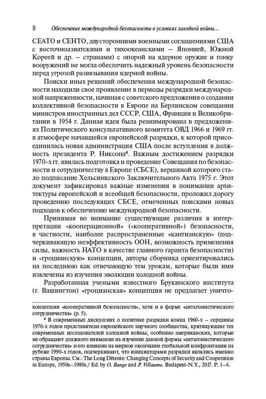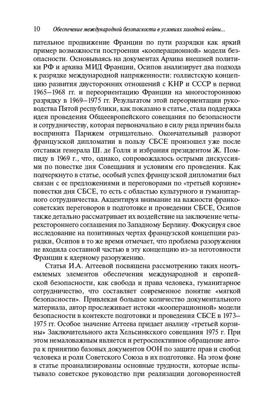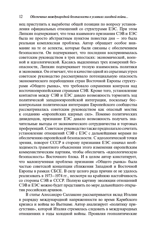 В сборнике рассматриваются внешнеполитические аспекты холодной войны, которые требовали налаживания сотрудничества между государствами противоборствующих военно-политических блоков в интересах обеспечения международной безопасности. Представленная историческая ретроспектива дает возможность проследить формирование отдельных компонентов современной модели «кооперационной» безопасности. Особое внимание авторов привлечено к подготовке и проведению Совещания по безопасности и сотрудничеству в Европе 1975 г., к использованию инструментов «мягкой силы» (гуманитарная сфера, экономика, общественное мнение) и международного права применительно к проблеме Мирового океана. В то же время на примерах интерпретации доктрины «сдерживания», оценок НАТО как «слабого звена», выявления причин неудачи экономических реформ в ГДР проанализировано практическое применение концепции блоковой безопасности, которая являлась доминирующей в годы холодной войны.