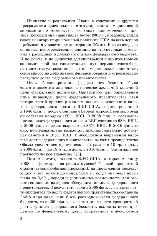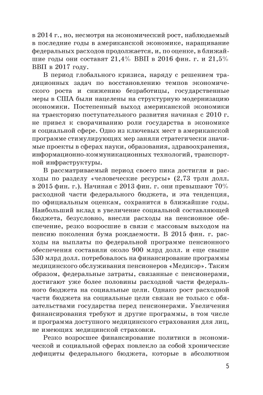 Период президентства Б. Обамы отмечен широкомасштабным использованием бюджетного механизма в государственном регулировании социально-экономических процессов. Выполнение бюджетных обязательств и реализация новых поставленных задач привели к росту государственного долга, остающегося в наследство новой администрации. В публикации рассмотрены ключевые направления бюджетного финансирования государственных мер в экономике и социальной сфере; особенности формирования доходной и расходной частей федерального бюджета, динамика государственного долга и выплачиваемых по нему процентов.