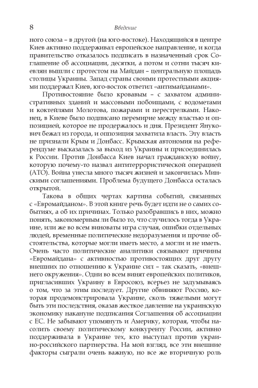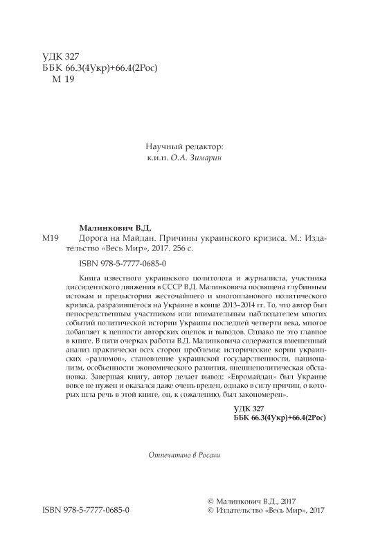 Книга известного украинского политолога и журналиста, участника диссидентского движения в СССР В.Д. Малинковича посвящена глубинным истокам и предыстории жесточайшего и многопланового политического кризиса, разразившегося на Украине в конце 2013–2014 гг. То, что автор был непосредственным участником или внимательным наблюдателем многих событий политической истории Украины последней четверти века, многое добавляет к ценности авторских оценок и выводов. Однако не это главное в книге. В пяти очерках работы В.Д. Малинковича содержится взвешенный анализ практически всех сторон проблемы: исторические корни украинских «разломов», становление украинской государственности, национализм, особенности экономического развития, внешнеполитическая обстановка. Завершая книгу, автор делает вывод: «Евромайдан» был Украине вовсе не нужен и оказался даже очень вреден, однако в силу причин, о которых шла речь в этой книге, он, к сожалению, был закономерен».