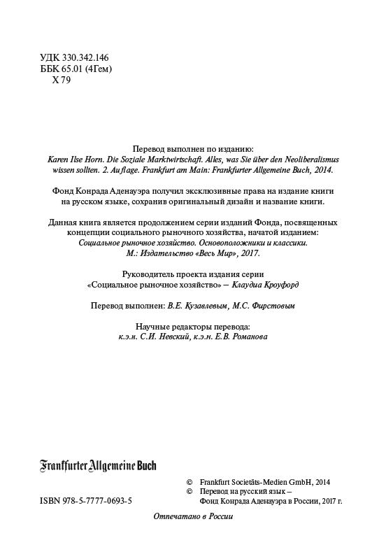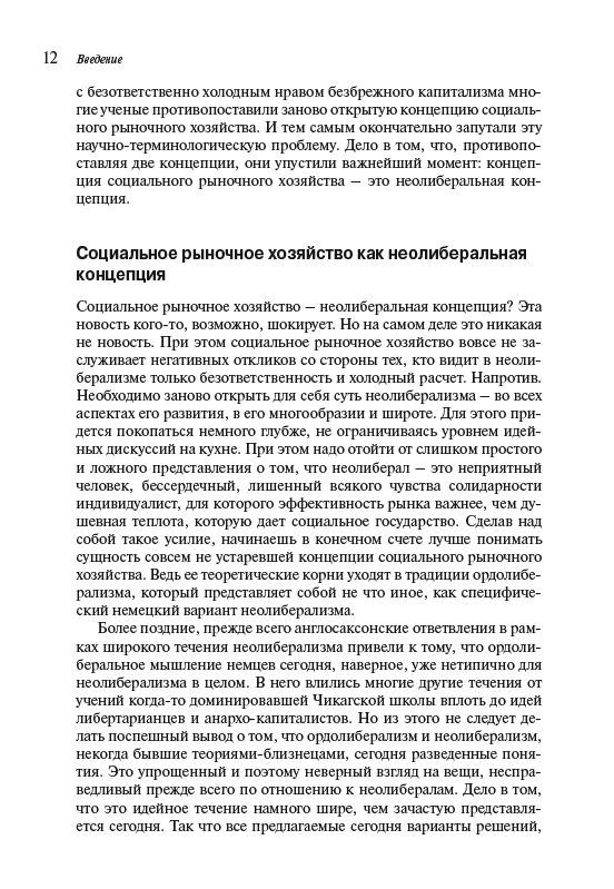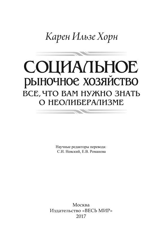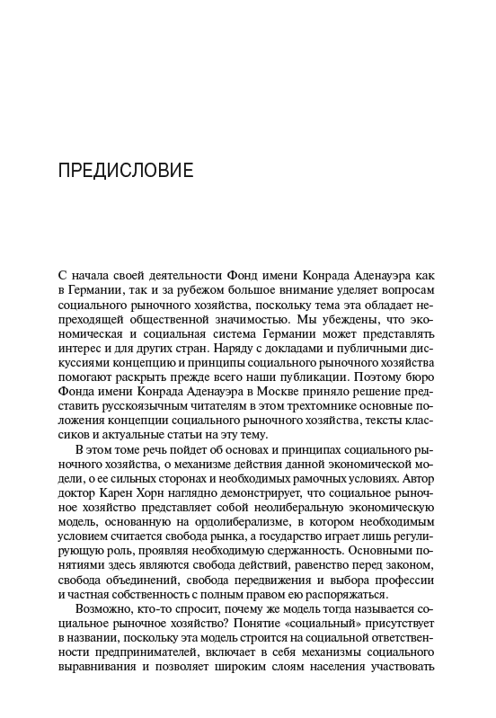 Книга немецкого экономиста и публициста К.И. Хорн посвящена возникновению и развитию концепции социального рыночного хозяйства. Автор рассматривает основные этапы становления концепции и комментирует важнейшие принципы концепции неолиберализма и конкурентного порядка. В книге излагаются ключевые идеи классиков экономической мысли: В. Ойкена, Ф. Бёма, И. Канта, Ф. фон Хайека, А. Смита, Д. Рикардо, Р. Кобдена, Р. Коуза, А. Мюллер-Армака, Л. Эрхарда и других. Издание снабжено указателем терминов.