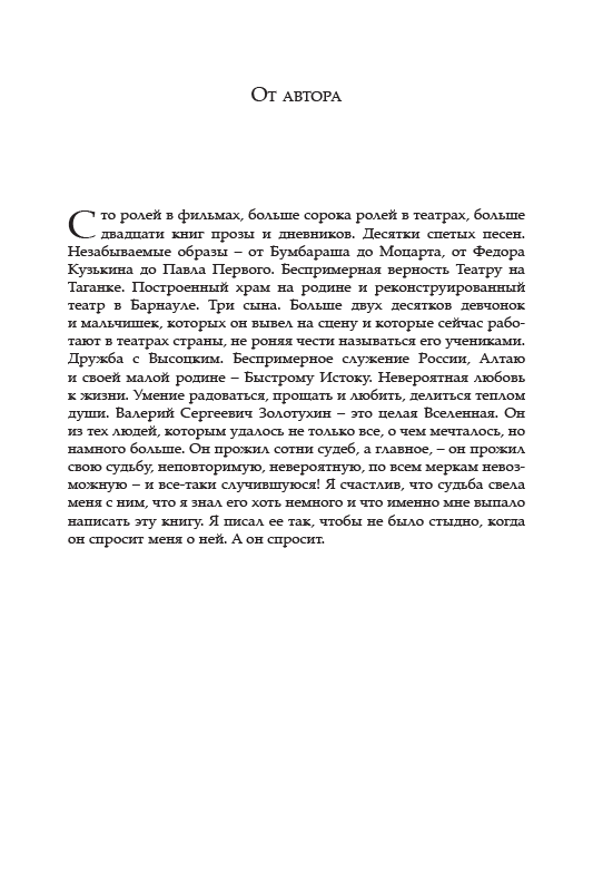 Сто ролей в фильмах, больше сорока ролей в театрах, больше двадцати книг прозы и дневников. Десятки спетых песен. Незабываемые образы — от Бумбараша до Моцарта, от Федора Кузькина до Павла Первого. Беспримерная верность Театру на Таганке. Построенный храм на родине и реконструированный театр в Барнауле. Три сына. Больше двух десятков девчонок и мальчишек, которых он вывел на сцену и которые сейчас работают в театрах страны, не роняя чести называться его учениками. Дружба с Высоцким. Беспримерное служение России, Алтаю и своей малой родине — Быстрому Истоку. Невероятная любовь к жизни. Умение радоваться, прощать и любить, делиться теплом души. Валерий Сергеевич Золотухин — это целая Вселенная. Он из тех людей, которым удалось не только все, о чем мечталось, но намного больше. Он прожил сотни судеб, а главное, — он прожил свою судьбу, неповторимую, невероятную, по всем меркам невозможную — и все-таки случившуюся! Я счастлив, что судьба свела меня с ним, что я знал его хоть немного и что именно мне выпало написать эту книгу. Я писал ее так, чтобы не было стыдно, когда он спросит меня о ней. А он спросит.