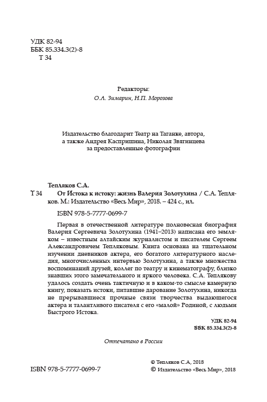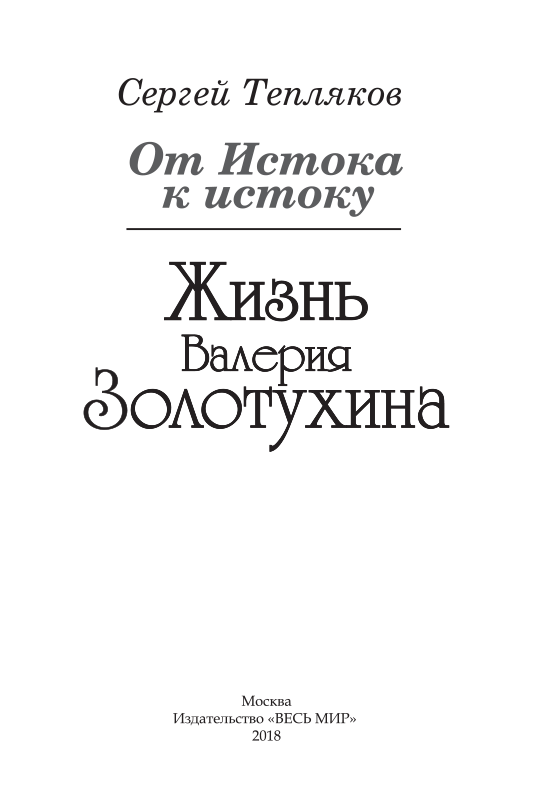 Первая в отечественной литературе полновесная биография Валерия Сергеевича Золотухина (1941–2013) написана его земляком – известным алтайским журналистом и писателем Сергеем Александровичем Тепляковым. Книга основана на тщательном изучении дневников актера, его богатого литературного наследия, многочисленных интервью Золотухина, а также множества воспоминаний друзей, коллег по театру и кинематографу, близко знавших этого замечательного и яркого человека. С.А. Теплякову удалось создать очень тактичную и в каком-то смысле камерную книгу, показать истоки, питавшие дарование Золотухина, никогда не прерывавшиеся прочные связи творчества выдающегося актера и талантливого писателя с его «малой» Родиной, с людьми Быстрого Истока.