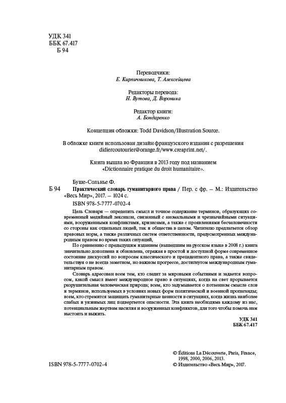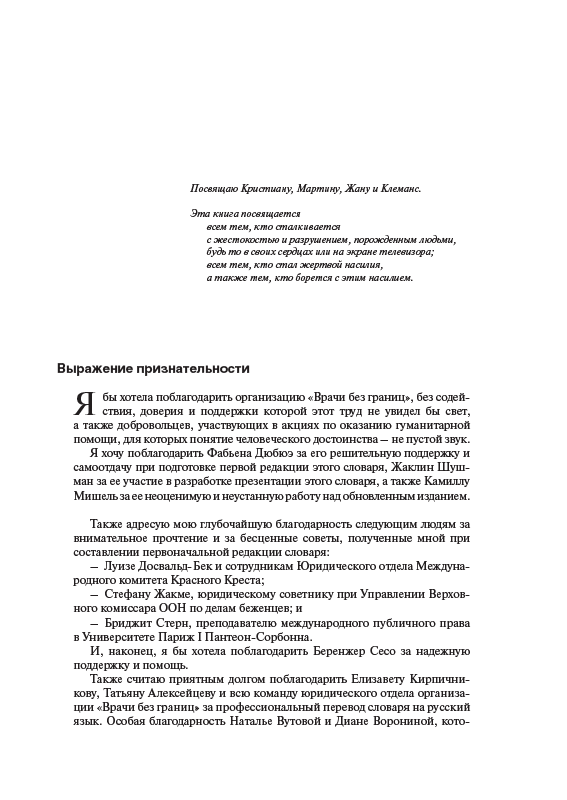 Словарь адресован всем тем, кто следит за мировыми событиями и задается вопросом, какой смысл имеет международное право в ситуациях, когда на свет прорывается разрушительная человеческая природа; всем, кто задумывается о потаенном смысле слов и терминов, используемых в условиях новых форм политической и военной пропаганды; всем, кто стремится защищать гуманитарные ценности в ситуациях, когда жизнь наиболее слабых и уязвимых лиц подвергается опасности. Эта книга необходима каждому из нас, потенциальным жертвам насилия и вооруженных конфликтов, для того чтобы помочь нам выстоять и выжить.
