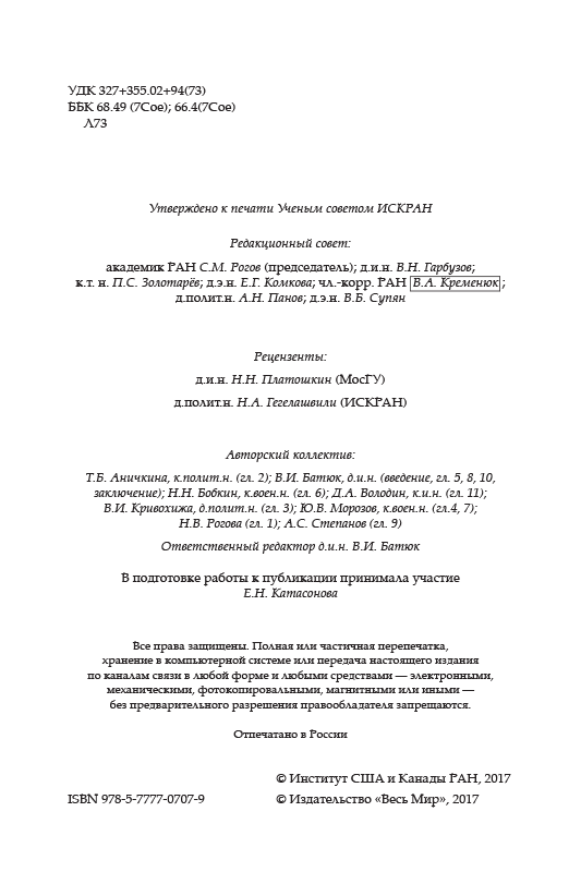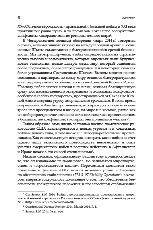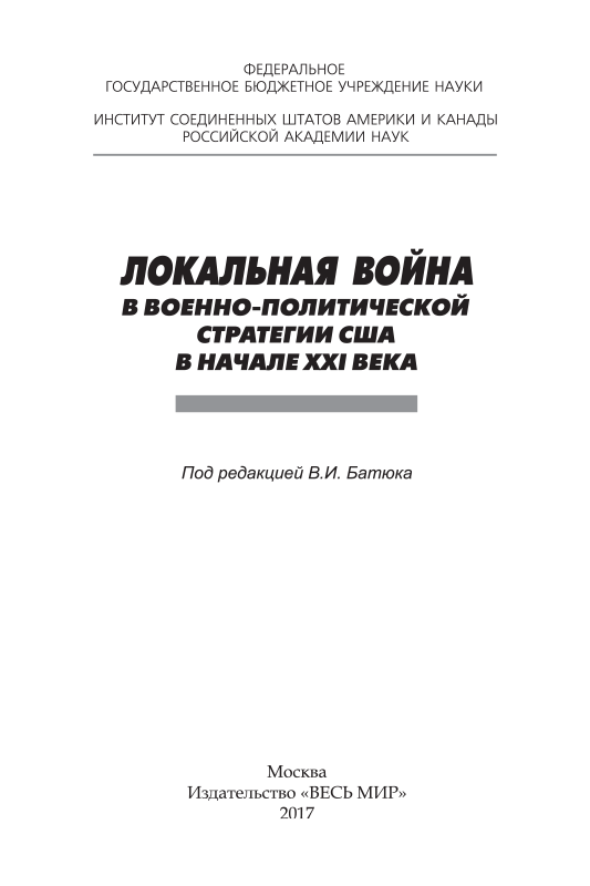 В книге, подготовленной в Институте США и Канады РАН анализируется то, как современная локальная война заставила американское военно-политическое руководство адаптировать вооруженные силы к новым реалиям, как это затронуло стратегию (в том числе и коалиционную), тактику и вооружение. Мощнейшая в мире военная машина оказалась недостаточно приспособленной к ведению войн локальных, главными противниками в которых оказываются террористические группировки, племенные ополчения.