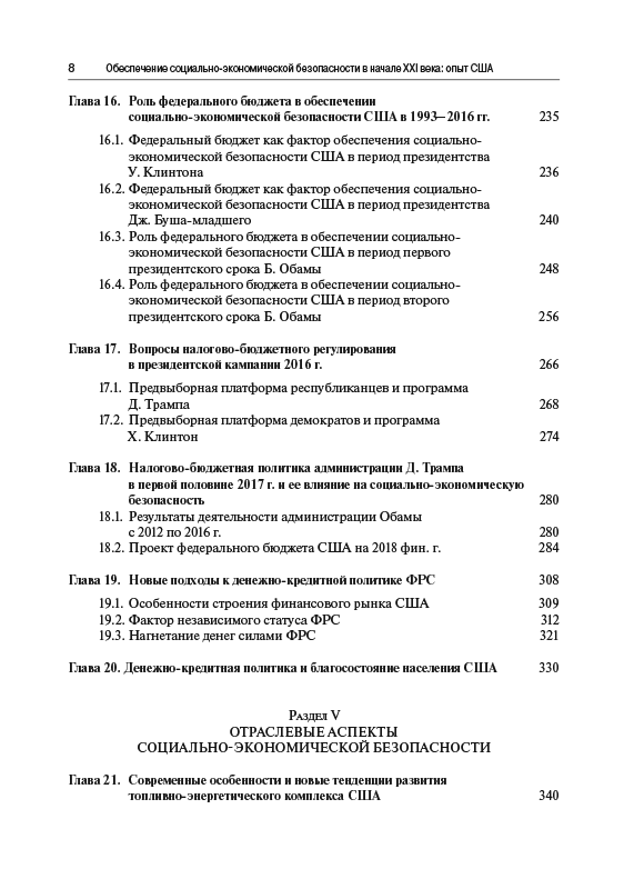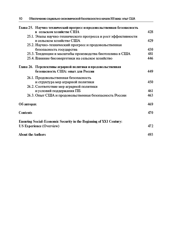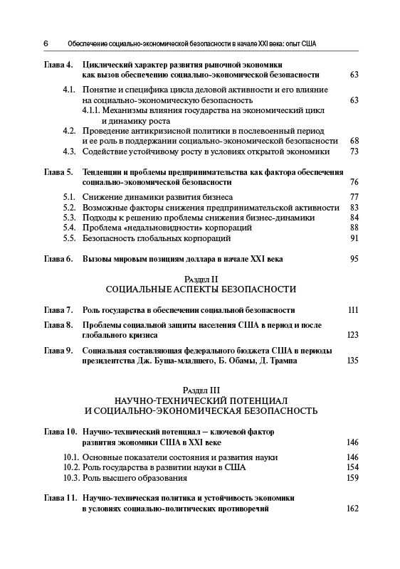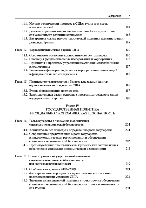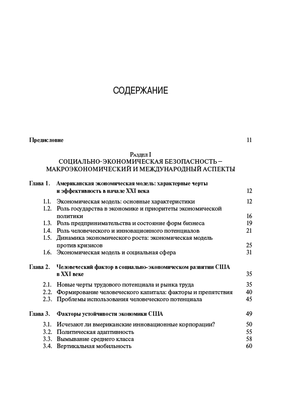 Работа состоит из 5 разделов. В первом – рассматриваются макроэкономические и международные аспекты социально-экономической безопасности. В частности, анализируются особенности американской экономической модели, циклические факторы развития экономики, роль человеческого фактора и предпринимательства в социально-экономическом развитии. Второй раздел посвящен социальным аспектам безопасности, в том числе роли социальных расходов бюджета. В третьем разделе анализируется значение научно-технического прогресса как фактора обеспечения социально-экономической безопасности. В четвертом разделе рассматривается роль государства в обеспечении социально-экономической безопасности, в том числе основные формы и методы регулирования экономики. И, наконец, в пятом разделе исследования рассматриваются некоторые наиболее важные отраслевые аспекты социально-экономической безопасности, в первую очередь в сфере энергетики и аграрно-промышленного комплекса.