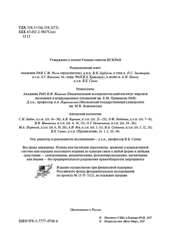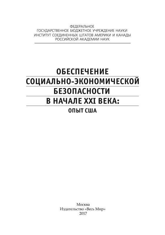 Коллективная монография экономических подразделений ИСКРАН подготовлена и издана при финансовой поддержке РФФИ (РГНФ) по проекту № 15-37-11121 «а(ц)» «Факторы обеспечения социально-экономической безопасности в начале XXI века: опыт США и его применение в российской практике».
