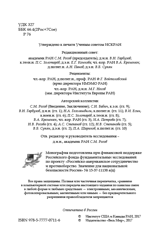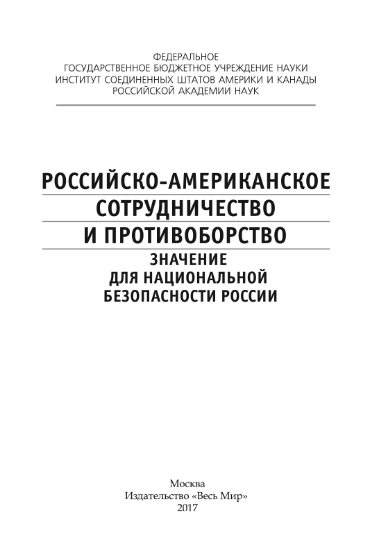 - Институт США и Канады проанализировал эту тему в книге: Российско-американское сотрудничество и противоборство. Значение для национальной безопасности России (под редакцией академика Сергея Михайловича Рогова).