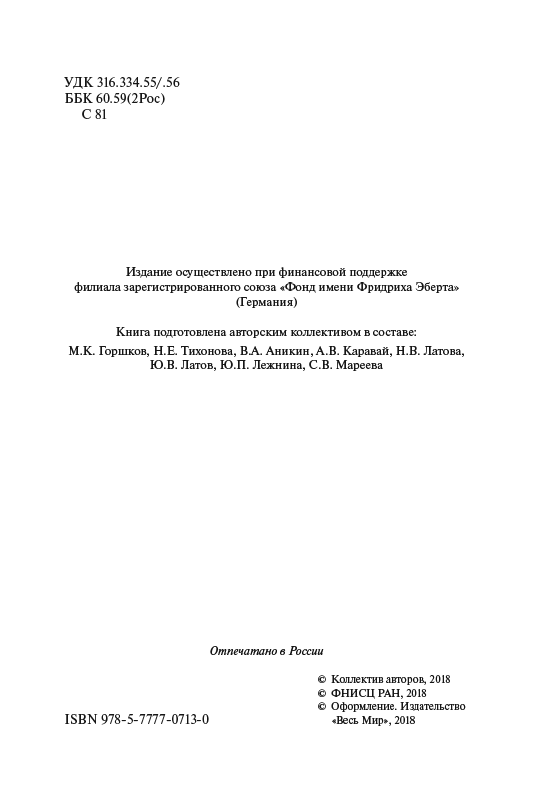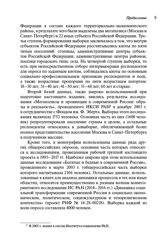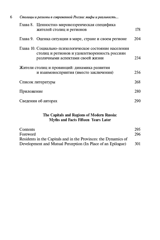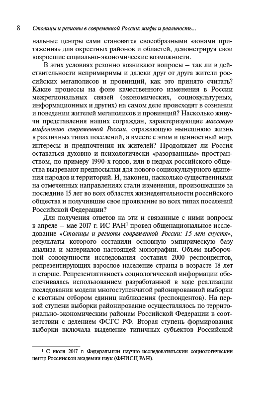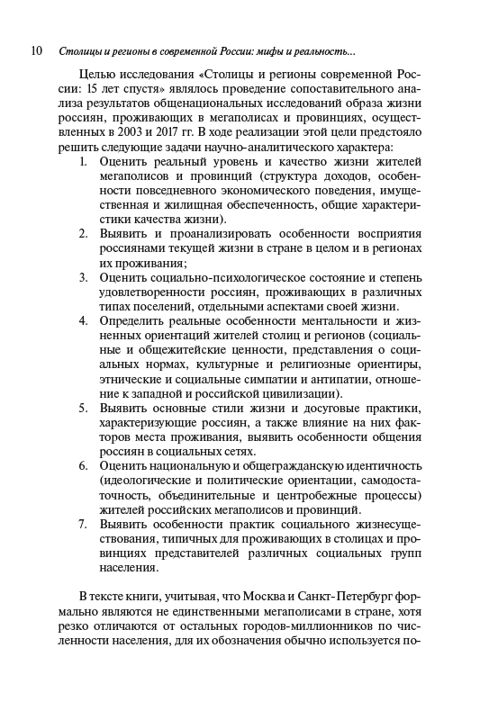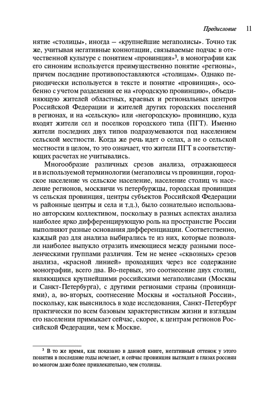 В книге представлены результаты ряда общенациональных исследований Института социологии РАН, выполненных в сотрудничестве с Представительством Фонда им. Ф. Эберта (Германия) в Российской Федерации в 2000–2017 гг. На их основе проведен сопоставительный анализ образа жизни россиян, проживающих в двух крупнейших российских мегаполисах (Москве и Санкт-Петербурге) и в других регионах страны. Показаны особенности уровня и качества жизни их жителей, специфика их занятости и поведения в интернет-пространстве, место в их жизни семьи и детей, динамика различных моделей досугового поведения, а также изменение традиционных гендерных ролей в разных типах поселений и особенности миграционного поведения их жителей. Особый интерес представляют имеющиеся в монографии данные о динамике восприятия своей жизни жителями столиц и разных типов населенных пунктов, о векторе изменения их мировоззрения и ценностных ориентаций, а также об оценках ими ситуации в стране в целом и в регионах проживания.