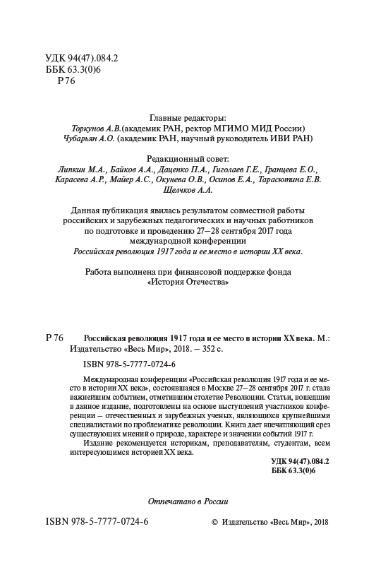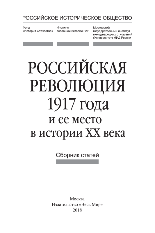 Международная конференции «Российская революция 1917 года и ее место в истории XX века», состоявшаяся в Москве 27–28 сентября 2017 г. стала важнейшим событием, отметившим столетие Революции. Статьи, вошедшие в данное издание, подготовлены на основе выступлений участников конференции – отечественных и зарубежных ученых, являющихся крупнейшими специалистами по проблематике революции. Книга дает впечатляющий срез существующих мнений о природе, характере и значении событий 1917 г.