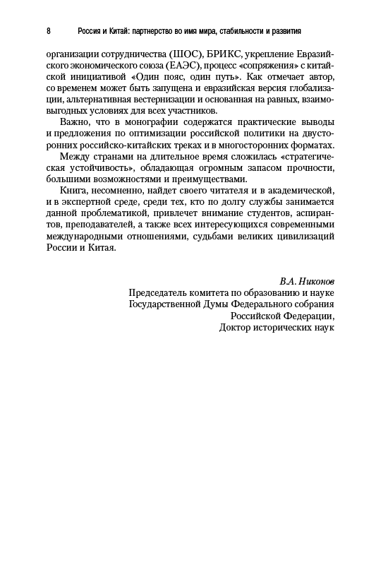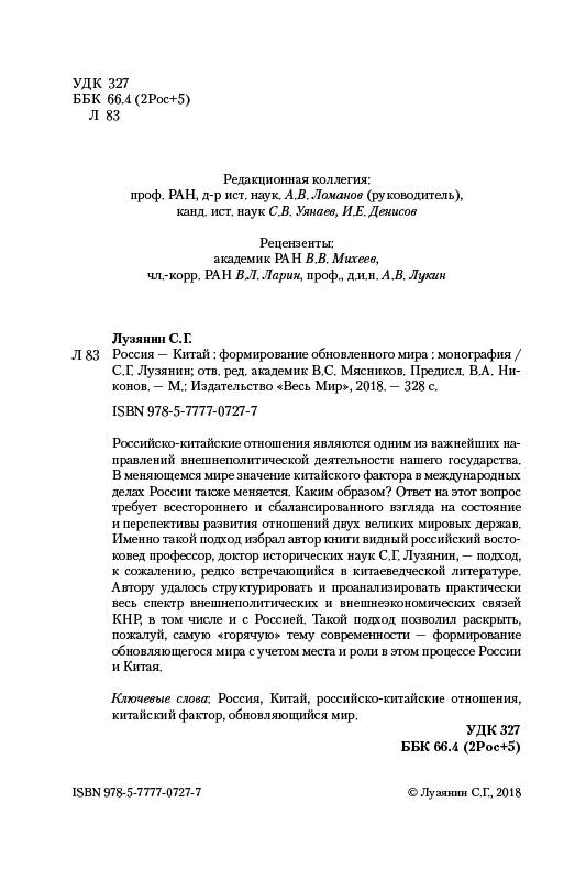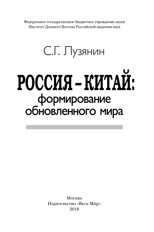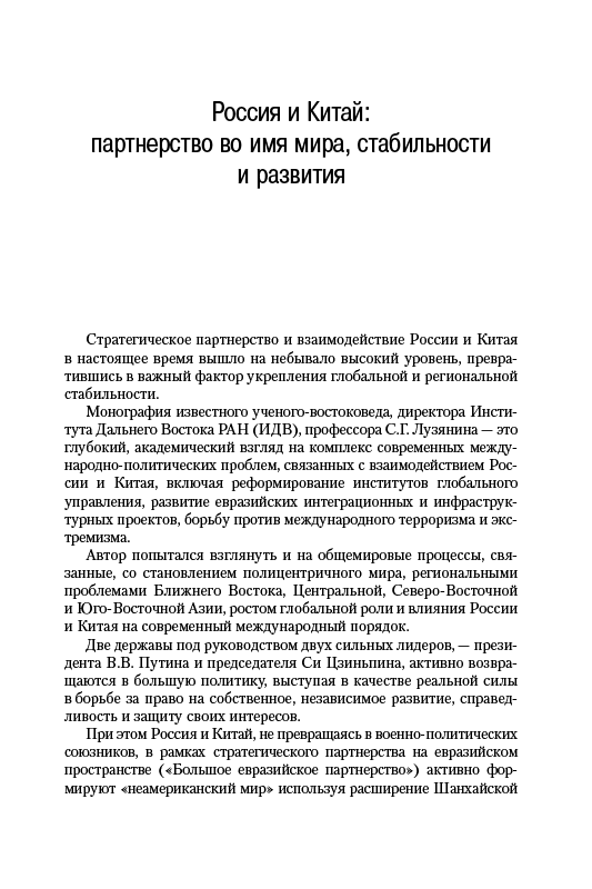 Российско-китайские отношения являются одним из важнейших направлений внешнеполитической деятельности нашего государства. В меняющемся мире значение китайского фактора в международных делах России также меняется. Каким образом? Ответ на этот вопрос требует всестороннего и сбалансированного взгляда на состояние и перспективы развития отношений двух великих мировых держав. Именно такой подход избрал автор книги видный российский востоковед профессор, доктор исторических наук С.Г. Лузянин, — подход, к сожалению, редко встречающийся в китаеведческой литературе. Автору удалось структурировать и проанализировать практически весь спектр внешнеполитических и внешнеэкономических связей КНР, в том числе и с Россией. Такой подход позволил раскрыть, пожалуй, самую «горячую» тему современности — формирование обновляющегося мира с учетом места и роли в этом процессе России и Китая.