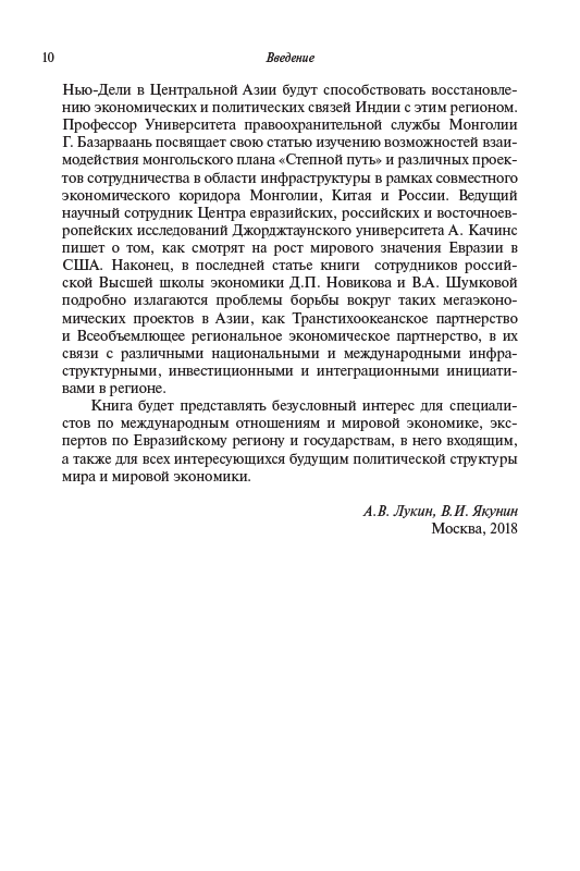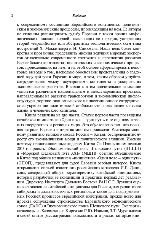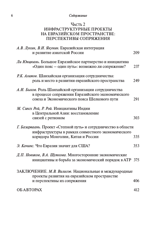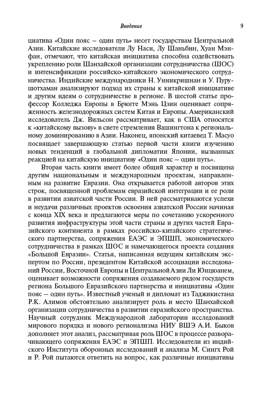 Книга состоит из двух частей. Статьи первой части посвящены китайской инициативе «Один пояс – один путь» и ее оценкам в разных государствах и регионах мира. Вторая часть книги имеет более общий характер. В ней анализируются другие национальные и международные проекты, направленные на развитие Евразии. Авторы показывают, что наличие самых различных инфраструктурных проектов в Евразии, разрабатываемых в Китае, Индии, государствах Центральной и Южной Азии и в Евросоюзе, создает для России как новые возможности, так и вызовы и требует концептуального переосмысления российской политики, разработки продуманных и эффективных решений.