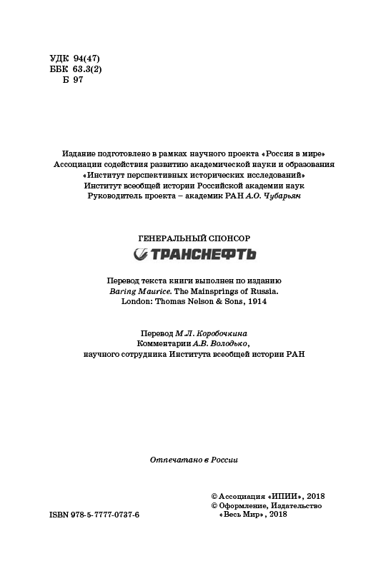 Одна из самых любопытных английских книг о России – «Что движет Россией» (The Mainsprings of Russia, 1914), написанная известным журналистом и литератором Морисом Бэрингом (1874–1945), впервые издается на русском языке. Публикуемая книга стала итоговым трудом писателя на русскую тему. Бэринг много путешествовал по России и в период 1905–1914 гг. создал несколько книг о России и русских, о русской литературе и культуре. Своими произведениями о России М. Бэринг пытался развеять ложные стереотипы восприятия всего русского в английском обществе и познакомить читателей с «уникальным волшебным очарованием России».