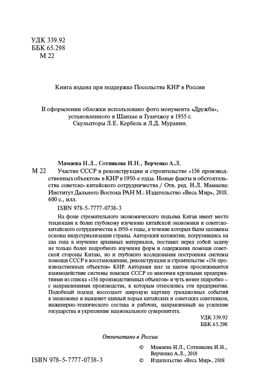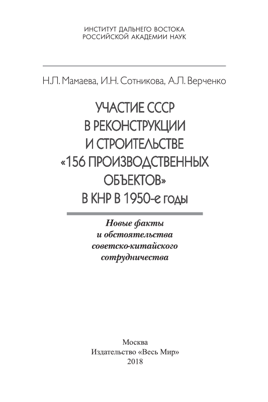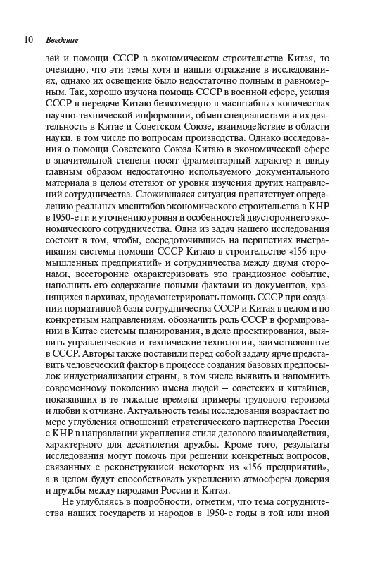 На фоне стремительного экономического подъема Китая имеет место тенденция к более глубокому изучению китайской экономики и советско-китайского сотрудничества в 1950-е годы, в течение которых были заложены основы индустриализации страны. Авторский коллектив, погрузившись на два года в изучение архивных материалов, поставил перед собой задачу не только более подробного изучения форм и содержания помощи советской стороны Китаю, но и глубокого исследования построения системы помощи СССР в восстановлении, реконструкции и строительстве «156 производственных объектов» КНР. Авторами шаг за шагом прослеживается взаимодействие системы помощи СССР со многими крупными предприятиями из списка «156 производственных объектов» и чуть менее подробно – с направлениями производства, к которым относились эти предприятия. Подобный подход воссоздает широкую картину грандиозных событий в экономике и выявляет единый порыв китайских и советских советников, инженерно-технического состава и рабочих, направленный на усиление государства и укрепление национального суверенитета.