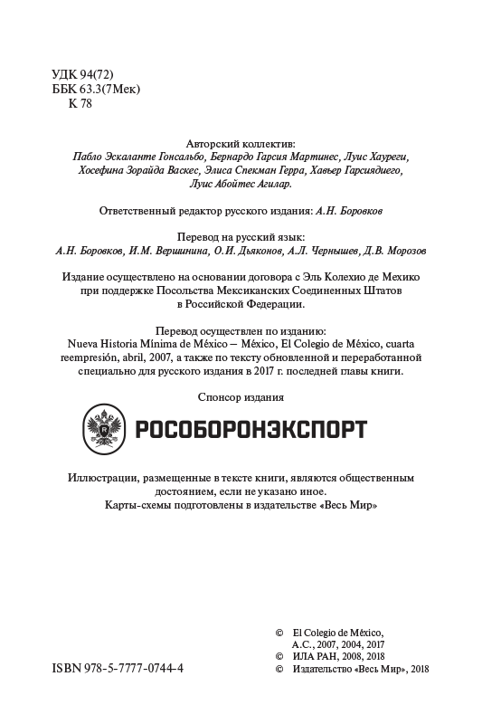 В этой книге мексиканские авторы в доступной и сжатой форме сумели изложить современные научные взгляды на историю своей страны, начиная с доколумбовой эпохи. Как и другие книги серии «Национальная история» История Мексики позволяет понять особенности исторического самосознания народа одной из крупнейших и бурно развивающихся стран мира. Перевод и научное редактирование текста были осуществлены сотрудниками Института Латинской Америка РАН. В основе второго русского издания книги – обновленный авторский текст, охватывающий события последнего времени вплоть до 2015 г. Издание снабжено иллюстрациями и картами.