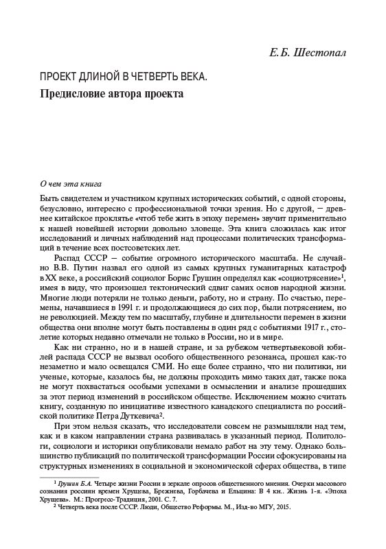 - На протяжении 25-ти лет группа ученых под руководством Елены Борисовны Шестопал изучала и наблюдала за тем как формируется и меняется восприятие политики гражданами России. Результаты проекта — в этой объемной и наполненной удивительно интересным материалом книге.