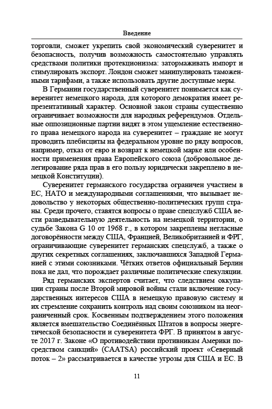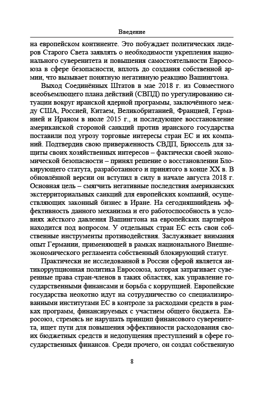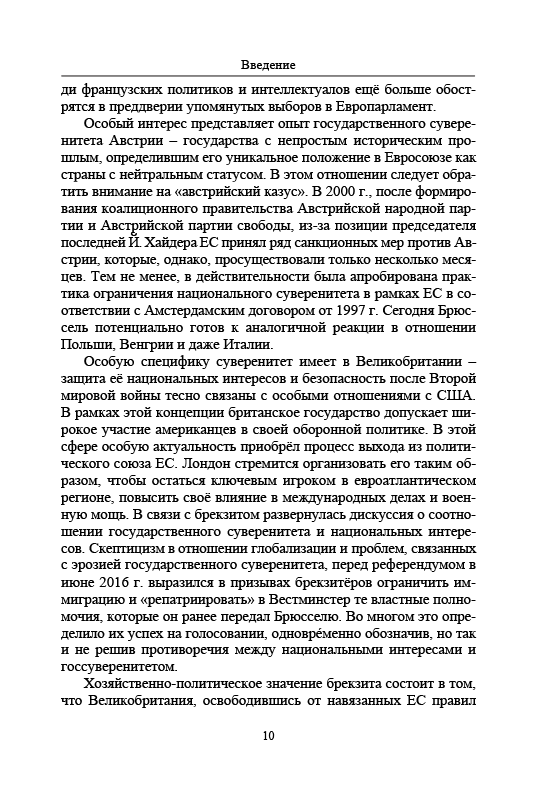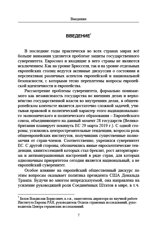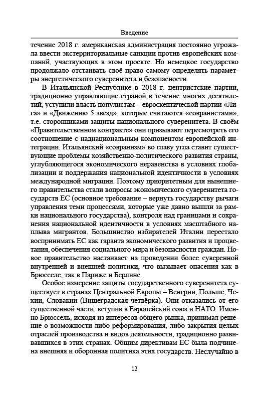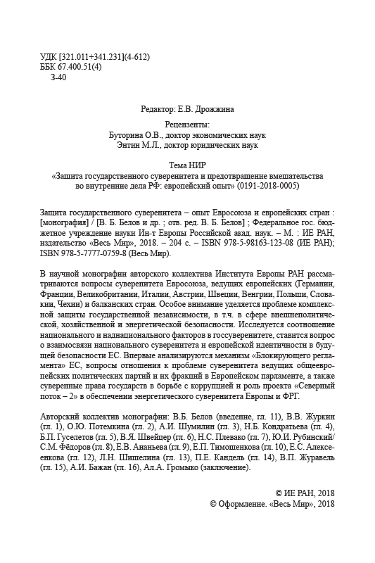 В научной монографии авторского коллектива Института Европы РАН рассматриваются вопросы суверенитета Евросоюза, ведущих европейских (Германии, Франции, Великобритании, Италии, Австрии, Швеции, Венгрии, Польши, Словакии, Чехии) и балканских стран. Особое внимание уделяется проблеме комплексной защиты государственной независимости, в т.ч. в сфере внешнеполитической, хозяйственной и энергетической безопасности. Исследуется соотношение национального и наднационального факторов в госсуверенитете, ставится вопрос о взаимосвязи национального суверенитета и европейской идентичности в будущей безопасности ЕС. Впервые анализируются механизм «Блокирующего регламента» ЕС, вопросы отношения к проблеме суверенитета ведущих общеевропейских политических партий и их фракций в Европейском парламенте, а также суверенные права государств в борьбе с коррупцией и роль проекта «Северный поток – 2» в обеспечении энергетического суверенитета Европы и ФРГ.