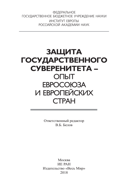 - В Институте Европы подготовили книгу (отв. ред. В. Б. Белов) «Защита государственного суверенитета — опыт Евросоюза и европейских стран».