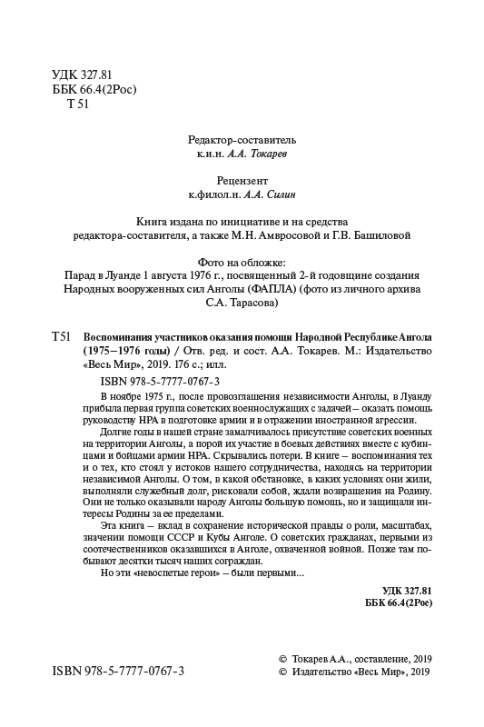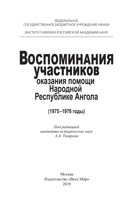 - Под редакцией Андрея Александровича Токарева (Институт Африки РАН) вышла книга «Воспоминания участников оказания помощи Народной Республике Ангола (1975–1976 годы)».