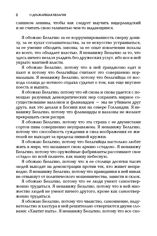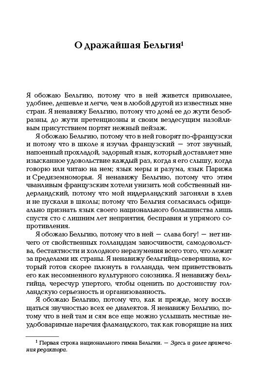 - Я обожаю Бельгию, потому что в ней живется привольнее, удобнее, дешевле и легче, чем в любой другой из известных мне стран. Я ненавижу Бельгию, потому что дома ее до жути безобразны, до жути претенциозны и своим вездесущим назойливым присутствием портят...