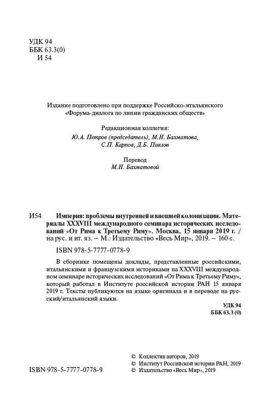 В сборнике помещены доклады, представленные российскими, итальянскими и французскими историками на XXXVIII международном семинаре исторических исследований «От Рима к Третьему Риму», который работал в Институте российской истории РАН 15 января 2019 г. Тексты публикуются на языке оригинала и в переводе на русский/итальянский языки.