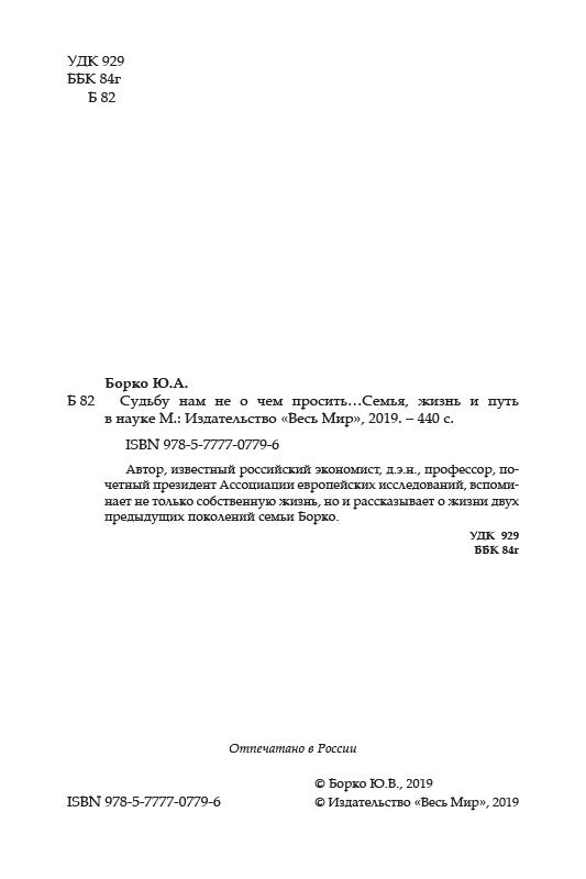 Автор, известный российский экономист, д.э.н., профессор, почетный президент Ассоциации европейских исследований, вспоминает не только собственную жизнь, но и рассказывает о жизни двух предыдущих поколений семьи Борко.