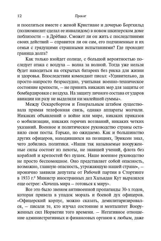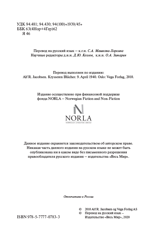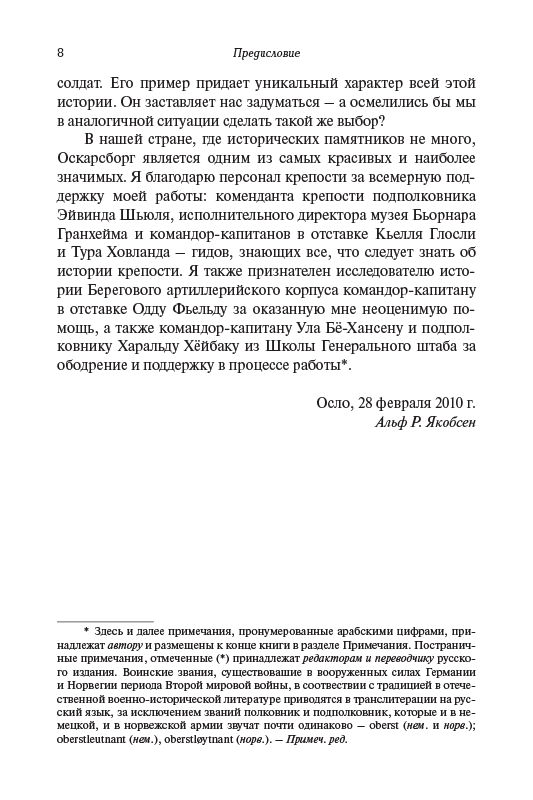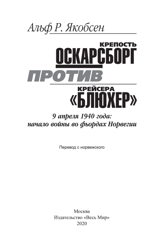 Внезапное нападение нацистской Германии на Норвегию 9 апреля 1940 г. («Операция Везерюбунг») стало важным этапом начального периода Второй мировой войны. Ключевую роль в реализации плана вторжения отводилась десантной Группе 5 во главе с новейшим немецким крейсером «Блюхер», которая должна была захватить столицу страны Осло. Нейтральная Норвегия не была готова сопротивляться, правительство страны не реагировало на сообщения о готовящемся нападении. В этих условиях верность долгу и смелость проявил комендант крепости Оскарсборг полковник Биргер Эриксен, отдавший приказ открыть огонь из устаревших орудий по мощным кораблям вторжения. Крейсер «Блюхер» был потоплен, а гитлеровский план захвата короля, правительства и золотого запаса Норвегии сорван. Этому драматическому поединку крепости и крейсера, столкновению характеров защитников Оскарсборга и захватчиков, посвящена книга норвежского историка А. Якобсена.