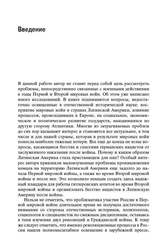 В работе рассматриваются малоизвестные страницы истории двух мировых войн XX века, связанные со странами Латинской Америки. Автор исследует, что принесли народам Латинской Америки Первая и Вторая мировые войны, как изменялось отношение разных слоев латиноамериканского общества к событиям, происходящим на полях сражений, к государствам-участникам двух войн и к самим войнам. Важное место отводится проникновению немцев в Южную Америку, использованию государств этого континента немецкой агентурой в период Второй мировой войны, а также бегству нацистов от наказания после поражения Германии в страны Латинской Америки. Исследуются проявления фашизма в латиномериканских государствах.
