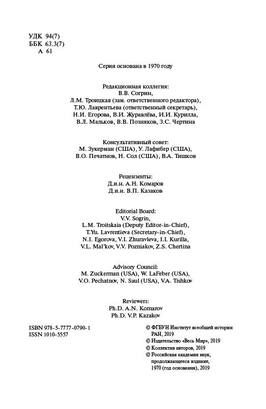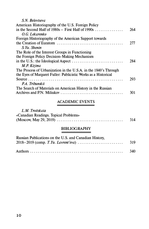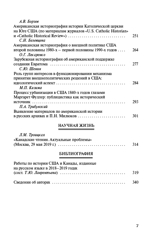 Сохранены традиционные рубрики «Научная жизнь» и «Библиография». В рубрике «Библиография» дан список публикаций на русском языке по истории США и Канады, вышедших в свет в 2018–2019 гг. Для историков, политологов, культурологов и всех, кто интересуется историей США и Канады.