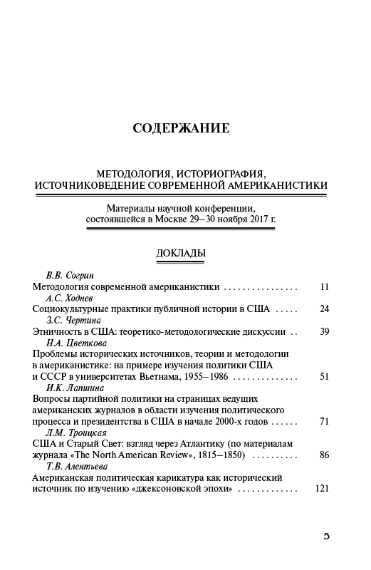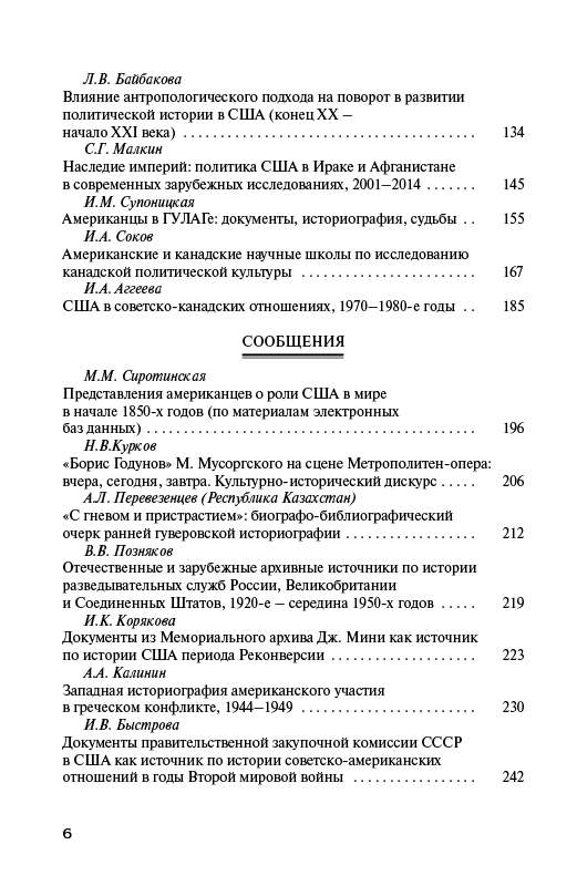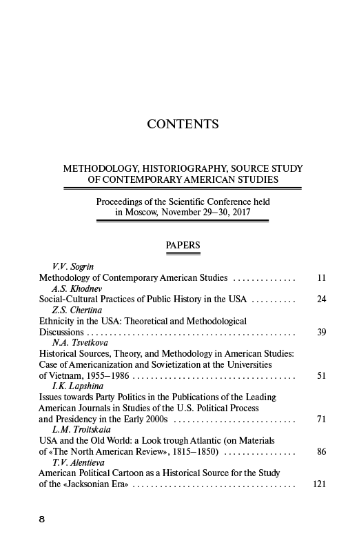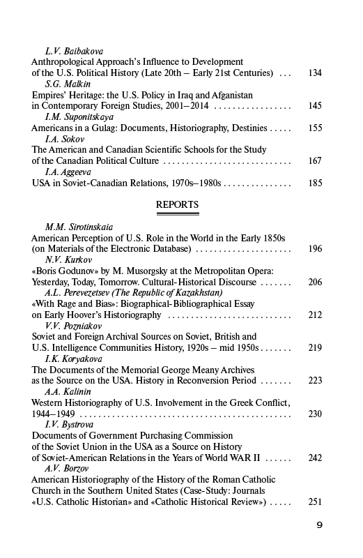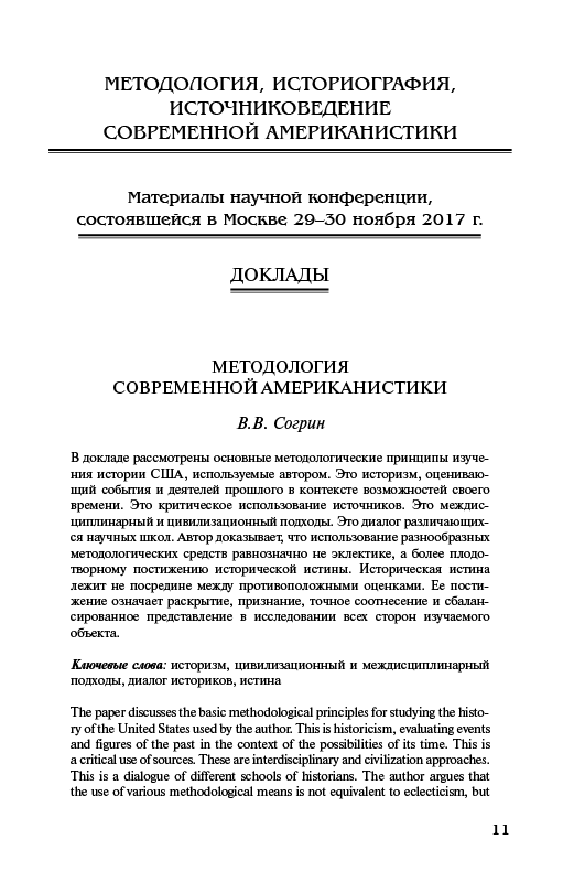 Основная рубрика открывается докладом д.и.н., проф В.В. Согрина, посвященным методологии современной американистики. Публикуются доклады об особенностях публичной истории США, теоретико-методологических дискуссиях по проблемам этничности в США, влиянии антропологического подхода на политическую историографию США конца XX – начала XXI века, судьбе американцев в ГУЛАГе и др. В рубрике «Сообщения» представлены материалы, в которых рассмотрены проблемы восприятия США в мире в середине XIX в., деятельности закупочной комиссии СССР в США в годы Второй мировой войны, культурно-исторического дискурса на примере постановки оперы «Борис Годунов» М. Мусоргского в Метрополитен-опера (США) и др.