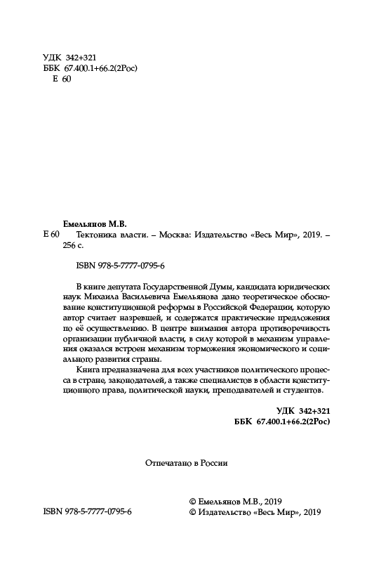 В книге депутата Государственной Думы, кандидата юридических наук Михаила Васильевича Емельянова дано теоретическое обоснование конституционной реформы в Российской Федерации, которую автор считает назревшей, и содержатся практические предложения по её осуществлению. В центре внимания автора противоречивость организации публичной власти, в силу которой в механизм управления оказался встроен механизм торможения экономического и социального развития страны.