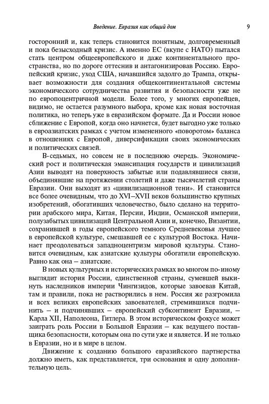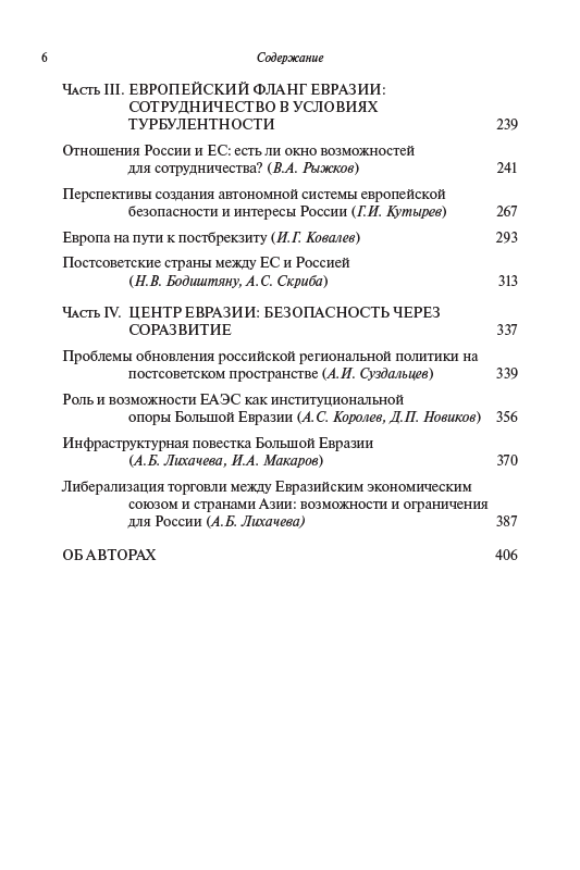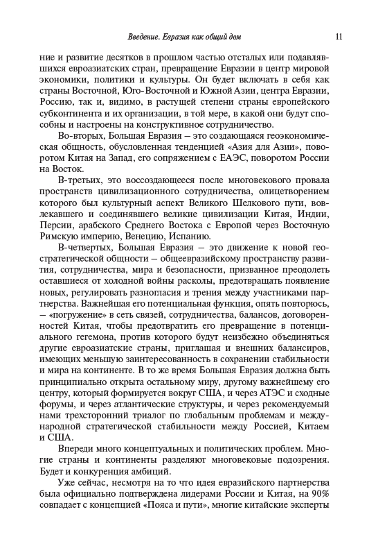 Книга посвящена проблемам международного развития и сотрудничества на евразийском континентальном пространстве. Авторы (в основном сотрудники НИУ ВШЭ, а также их коллеги из других научных центров) исходят из убеждения, что это пространство обладает значительным центростремительным потенциалом, который ведет к созданию единой Большой Евразии «от Лиссабона до Сингапура». Кажущееся чрезвычайно амбициозным, его формирование столь же возможно, сколь и необходимо для России и других евразийских государств. В книге четыре раздела. В первом из них рассмотрены геополитические предпосылки Большой Евразии. В трех других разделах освещены проблемы, существующие в основных географических областях Большой Евразии. Монография является приглашением к дискуссии как по частным проблемам, которые в них затрагиваются, так и по более общим вопросам развития России, ее внешнеполитических приоритетов, ее роли в меняющемся и противоречивом мире.
