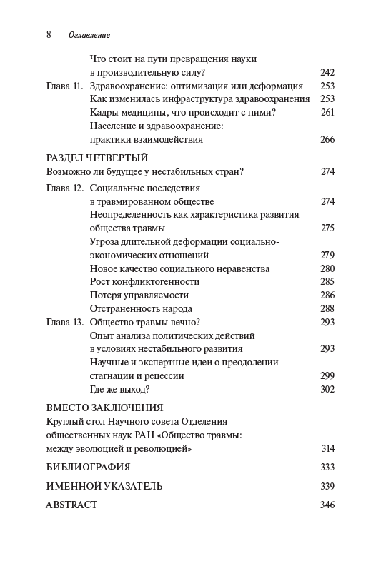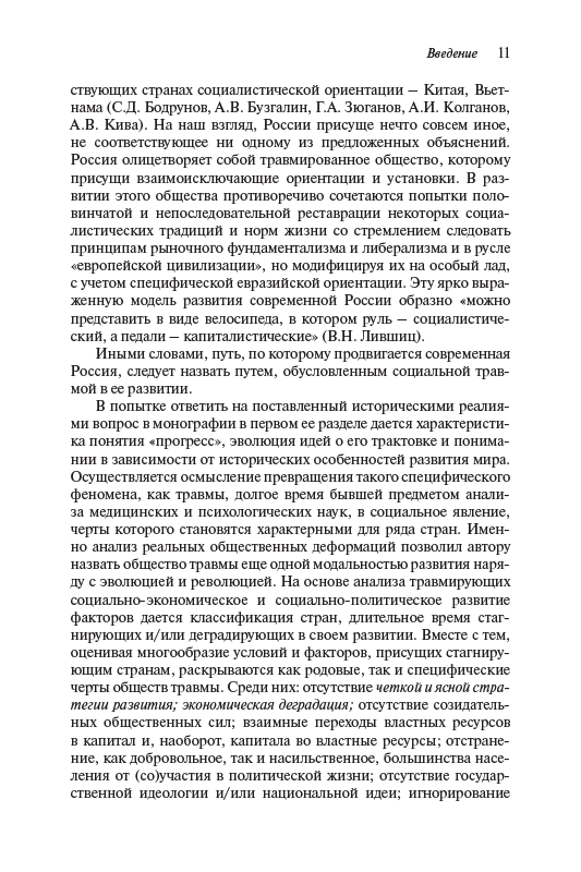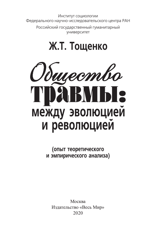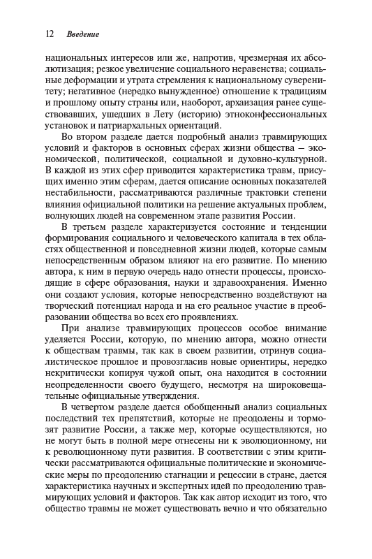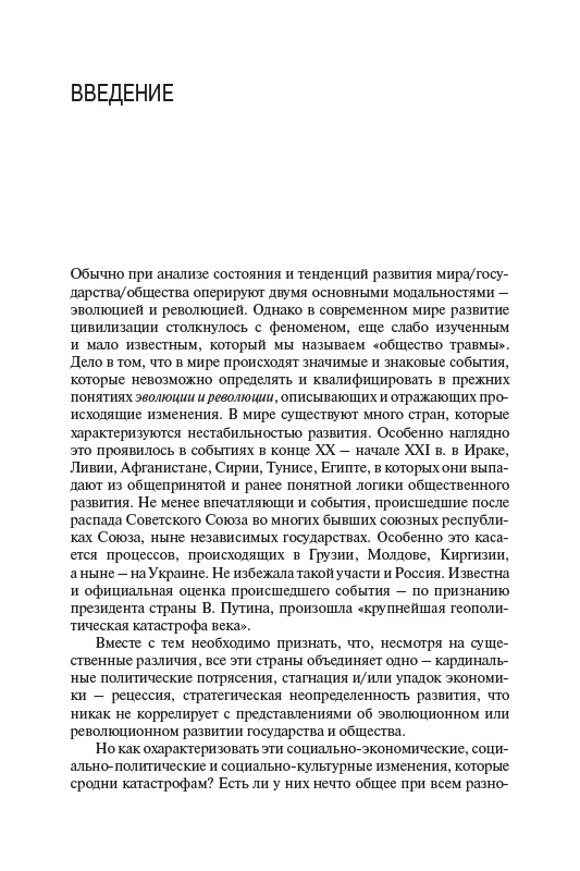 В монографии чл.-корр. РАН, д.ф.н. Ж.Т. Тощенко рассматривается малоизученный феномен современной цивилизации – травма общества. Состояние государства, в течение длительного периода находящегося в процессе хаотичного, несбалансированного и турбулентного развития, нельзя описать в понятиях основных признанных путей развития – революции и эволюции. В книге показано, что понятие «травма» уже приобрело социальное звучание, оно осмысливается в научной литературе и находит отражение в политической лексике. Монография раскрывает сущностные характеристики общества травмы, причины его появления, следствия его функционирования. Особое внимание уделяется России, отринувшей социалистическое прошлое, но не достигшей рубежей, с которых начинала свои реформы. В мозаике российских преобразований почти невозможно различить как эволюционные, так и революционные тенденции. Автор дает анализ препятствий, стоящих на пути осуществления подлинно демократического, эффективно функционирующего общества, что в свою очередь позволяет ему определить пути выхода из состояния травмированного общества.