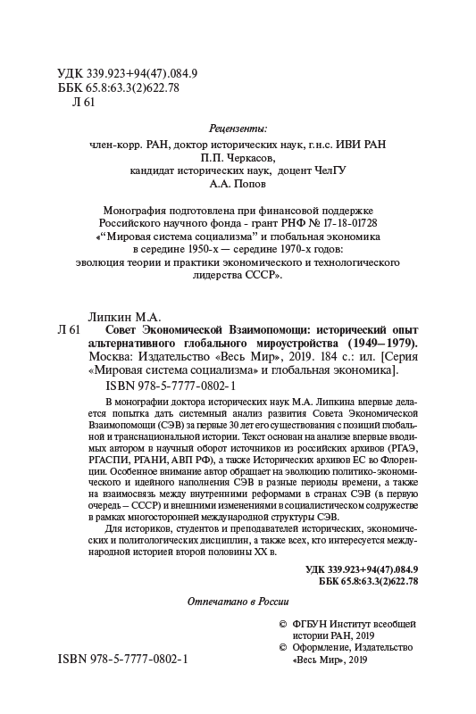 В монографии доктора исторических наук М.А. Липкина впервые делается попытка дать системный анализ развития Совета Экономической Взаимопомощи (СЭВ) за первые 30 лет его существования с позиций глобальной и транснациональной истории. Текст основан на анализе впервые вводимых автором в научный оборот источников из российских архивов (РГАЭ, РГАСПИ, РГАНИ, АВП РФ), а также Исторических архивов ЕС во Флоренции. Особенное внимание автор обращает на эволюцию политико-экономического и идейного наполнения СЭВ в разные периоды времени, а также на взаимосвязь между внутренними реформами в странах СЭВ (в первую очередь – СССР) и внешними изменениями в социалистическом содружестве в рамках многосторонней международной структуры СЭВ.