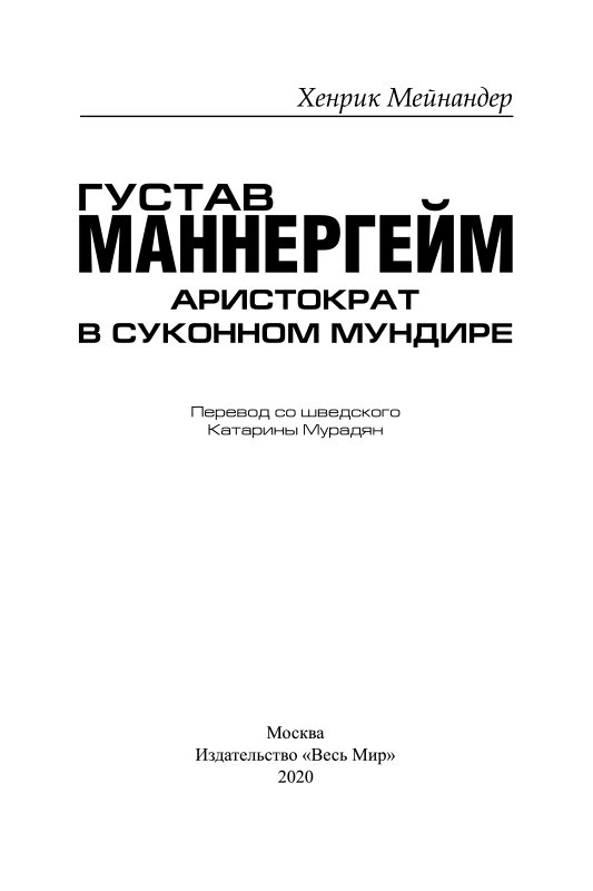 Известный финский историк, пишущий по-шведски, Хенрик Мейнандер написал свою биографию национального героя Финляндии, маршала Карла Густава Маннергейма, опираясь на многолетние исследования и обширные знания, приобретенные за годы, когда он возглавлял Музей Маннергейма в Хельсинки. Особенность этой относительно небольшой и обращенной к широкому читателю книги в том, что автор стремился раскрыть основные черты личности Маннергейма, его характер, мотивы его поступков. Автор опровергает немалое число мифов и недостоверных суждений о жизни своего героя. Масштаб личности Маннергейма велик, и его жизненный путь труден и многообразен. Финско-шведский аристократ, он сделал прекрасную карьеру в Российской империи, воевал в Русско-японской и Первой мировой войнах, возглавлял Белую армию в гражданской войне в Финляндии и командовал армией своей страны во всех войнах, в которых она участвовала в XX в. При этом Маннергейм был нужен стране не только тогда, когда она воевала, но и когда войны приходилось заканчивать. Президент Маннергейм вывел Финляндию из Второй мировой войны, подписав перемирие с СССР в 1944 г. Он был неординарной личностью, ярким и сильным человеком, жившим в бурное время, когда распадались империи и рождались страны. Его судьба неотделима от судьбы Финляндии, но она принадлежит и России.
