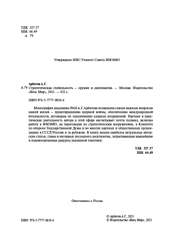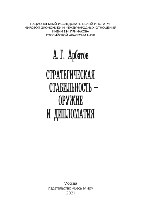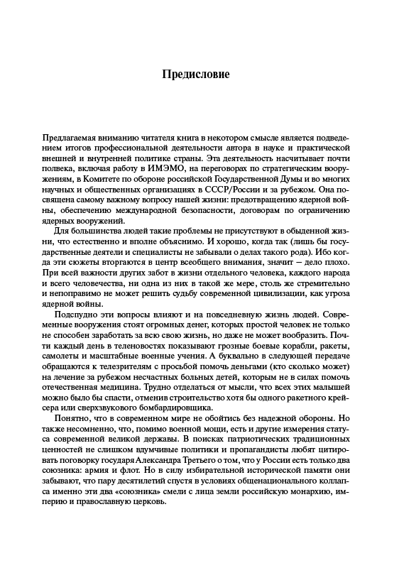 Монография академика РАН А.Г. Арбатова посвящена самым важным вопросам нашей жизни – предотвращению ядерной войны, обеспечению международной безопасности, договорам по ограничению ядерных вооружений. Научная и практическая деятельность автора в этой сфере насчитывает почти полвека, включая работу в ИМЭМО, на переговорах по стратегическим вооружениям, в Комитете по обороне Государственной Думы и во многих научных и общественных организациях в СССР/России и за рубежом. В книгу вошли наиболее актуальные авторские статьи, главы и интервью последнего десятилетия, затрагивающие важнейшие и взаимосвязанные ракурсы указанной тематики.