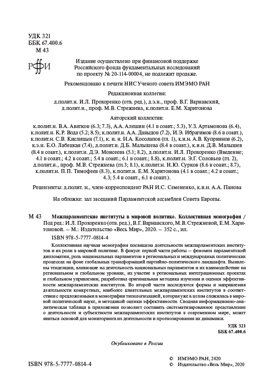 Коллективная научная монография посвящена деятельности межпарламентских институтов и их роли в мировой политике. В фокусе первой части работы – феномен парламентской дипломатии, роль национальных парламентов в региональных и международных политических процессах на фоне глобальных трансформаций партийно-политического ландшафта. Выявлены тенденции, влияющие на деятельность национальных парламентов и их взаимодействие на региональном и глобальном уровнях, их участие в региональных интеграционных проектах и глобальном управлении, разработана оригинальная методика изучения и оценки эффективности межпарламентских институтов. Во второй части исследуются формы и направления деятельности конкретных, наиболее влиятельных межпарламентских институтов в соответствии с предложенными в монографии типологизацией, которая уже в целом сложилась в мировой политической науке, и методикой оценки эффективности. Сводная информационно-аналитическая таблица в приложении позволяет составить систематизированное представление о деятельности и субъектности межпарламентских институтов в современном мире, может явиться основой для мониторинга их деятельности и прогнозирования их динамики.