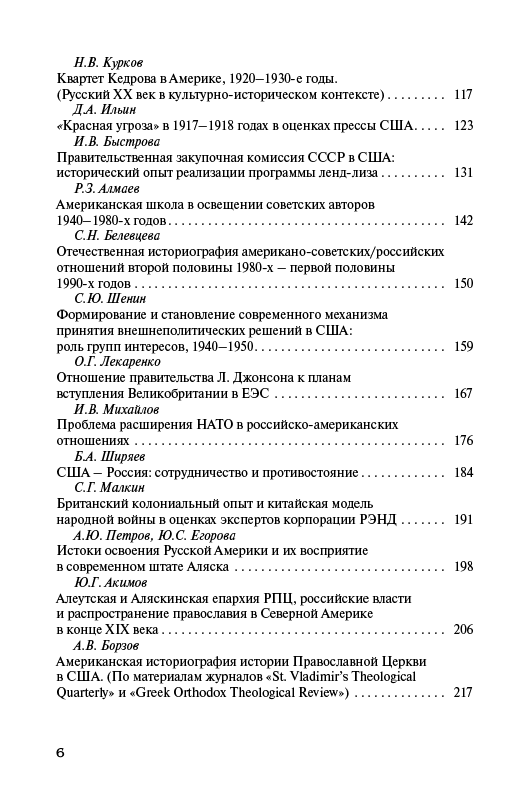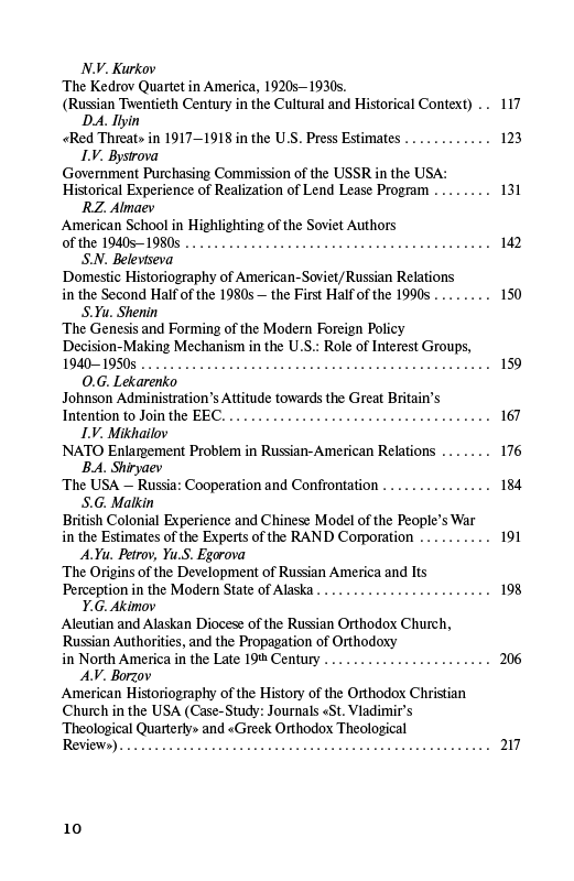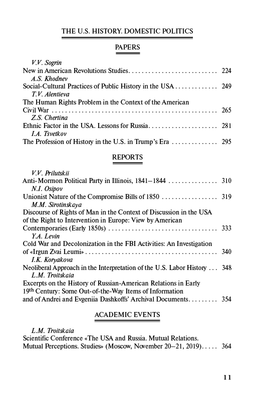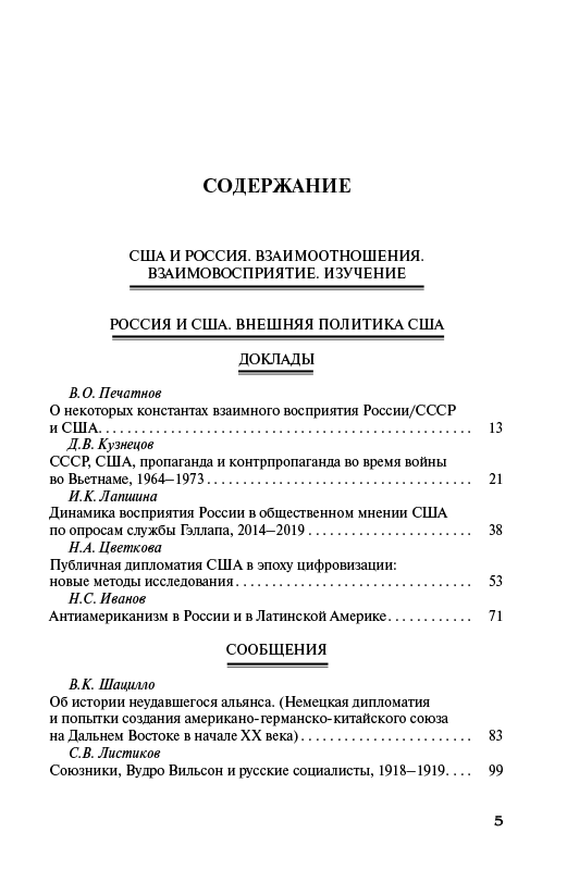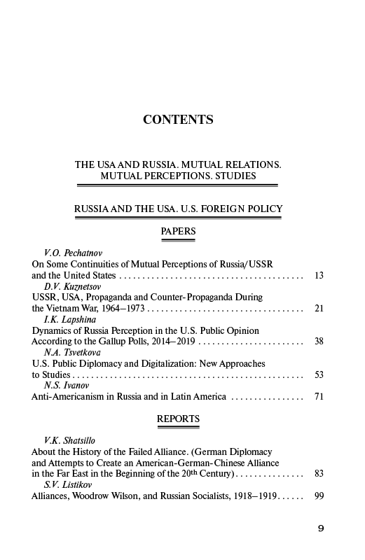 В рубрике «Россия и США. Внешняя политика США» рассмотрены константы взаимного восприятия России/СССР и США, восприятие России американским общественным мнением (2014–2019), особенности антиамериканизма в России и Латинской Америки, роль русской эмиграции в музыкальной жизни США в 1920–1930-х гг., некоторые аспекты православия в Соединенных Штатах, сохранения наследия Русской Америки в исторической памяти современной Аляски и т.д.
